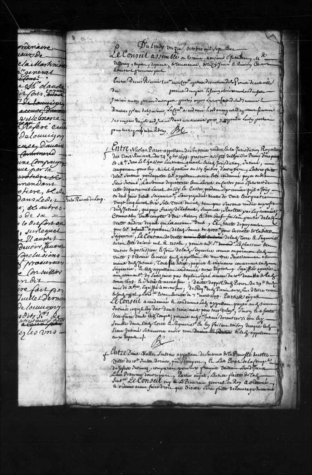 - Transcription du texte avec orthographe modernisée : «Entre Nicolas PERROT appelant de sentence rendue en la juridiction royale des Trois-Rivières du 24 novembre 1698 présent assisté de l'huissier Prieur d'une part, et maître Jean LECHASSEUR lieutenant général en ladite juridiction intimé, comparant pour lui Michel LePallieur aussi huissier, d'autre part, lecture faite de ladite sentence par laquelle ledit appelant aurait été condamné payer audit sieur intimé la somme de quatorze cents livres en castor pour l'intérêt de celle de quatre mille livres aussi en castor pendant sept années qu'il a joui ou dû jouir de la seigneurie de la Rivière-du-Loup, sans préjudice de celle de trois cent quatre-vingt-cinq livres dix sols trois deniers tant par sentence rendue au profit dudit intimé que pour frais de labour semences, récoltes par lui avancées, comme à lui tenir compte d'une maison et d'un boeuf faisant partie de ladite vente au dire de gens qui les auraient vus, et faute de payement par ledit appelant de ladite somme de quatre mille livres pour la vente de ladite seigneurie, le contrat de vente de ladite terre et seigneurie aurait été déclaré nul et résolu, permis audit sieur LeChasseur de rentrer en possession et jouir de ladite seigneurie comme auparavant ladite vente, ordonné en outre audit appelant de remettre incessamment en les mains dudit intimé tous les titres, papiers et originaux concernant ladite seigneurie et ledit appelant condamné aux dépens, signifiée à partie avec commandement d'y satisfaire par exploit signé Ameau du 10e décembre de ladite année 1698, et scellée le même jour; d'acte d'appel dudit Perrot du 29 dudit mois de décembre signifié le même jour; de requête dudit Perrot aux fins d'être reçu en sondit appel, l'ordonnance étant ensuite du 7e 1699. Parties ouïes, le Conseil a condamné et condamne ledit appelant payer audit sieur intimé ce qu'il lui doit dans trois mois pour tout délai en lui faisant raison de ce que ledit sieur intimé se trouvera avoir reçu, sinon et à faute de ce faire dans ledit temps permis audit intimé de rentrer si bon lui semble dans ladite terre et seigneurie, et ledit appelant aux dépens. BOCHART CHAMPIGNY.»