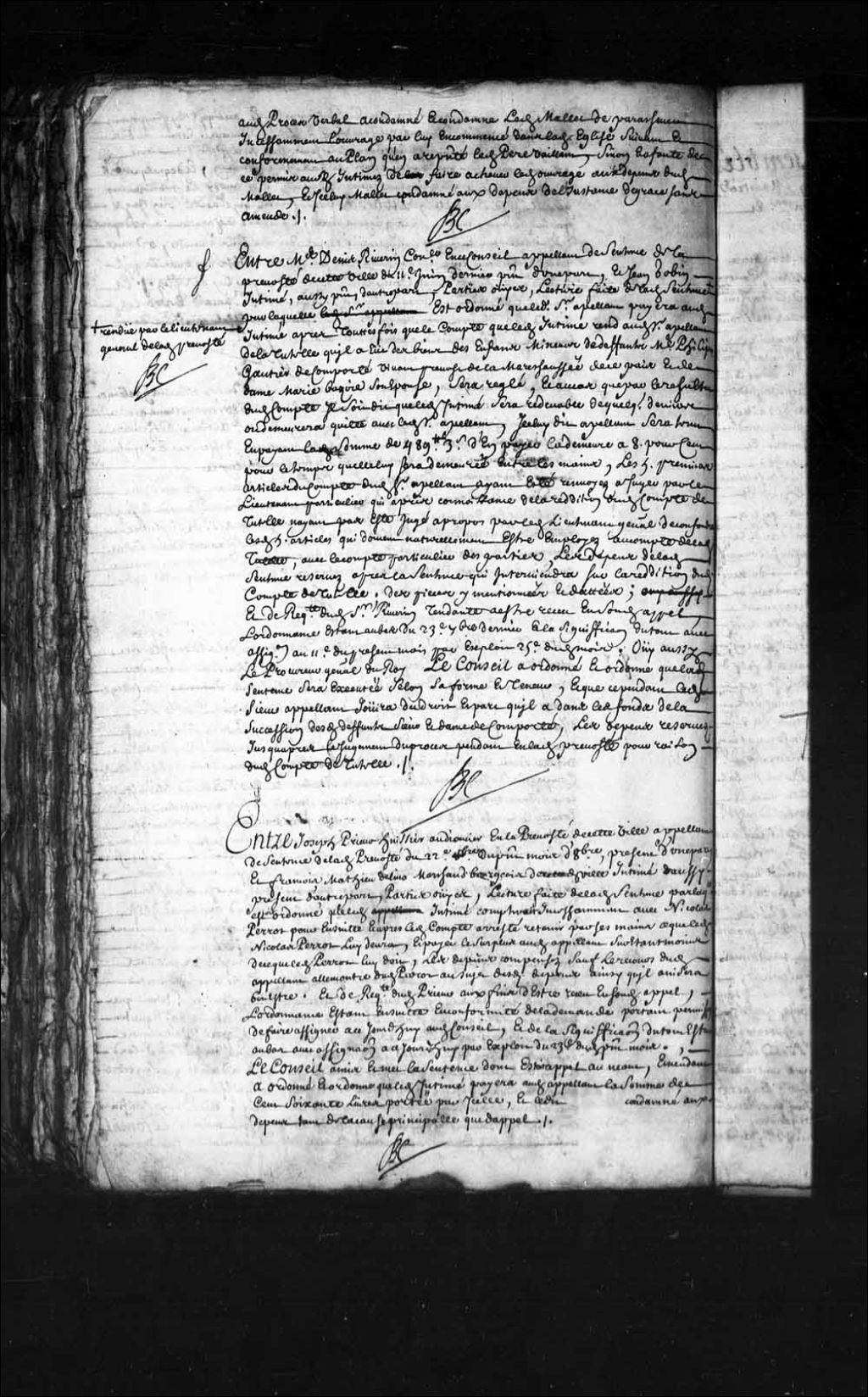 - Transcription du texte avec orthographe modernisée : «Entre Joseph PRIEUR huissier en la prévôté de cette ville appelant de sentence de ladite prévôté du 22e du présent mois d'octobre présent, d'une part, et François Mathieu DELINO (De Lino) marchand bourgeois de cette dite ville, intimé, aussi présent, d'autre part. Parties ouïes, lecture faite de ladite sentence par laquelle était ordonné que ledit intimé compterait incessamment avec Nicolas Perrot pour ensuite et après ledit compte arrêté, retenir pas ses mains ce que ledit Nicolas Perrot lui devra et payer le surplus audit appelant sur étant moins sur ce que ledit Perrot lui doit, les dépens compensés sauf le recours dudit appelant à l'encontre dudit Perrot au sujet desdits dépens ainsi qu'il avisera bon être, et de requête dudit Prieur aux fins d'être reçu en sondit appel. L'ordonnance étant ensuite en conformité de la demande portant permission de faire assigner à ce jourd'hui en ce Conseil, et de la signification du tout étant au bas avec assignation à ce jourd'hui par exploit du 23e dudit présent mois. Le Conseil a mis et met la sentence dont était appel au néant, émendant, a ordonné et ordonne que ledit intimé payera audit appelant la somme de cent soixante livres portée par icelle, et ledit Perrot aux dépens tant de la cause principale que d'appel. BOCHART CHAMPIGNY.»