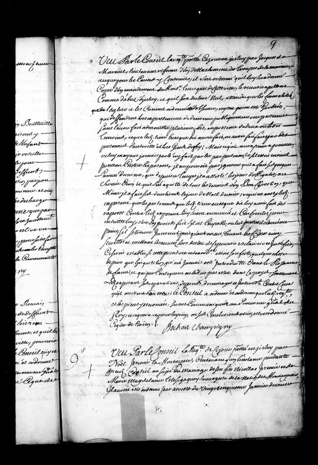 - Transcription du texte avec orthographe modernisée : «Vu par le Conseil la requête présentée ce jour en icelui par Jacques de Mareuil, lieutenant reformé du détachement des troupes de la marine, à ce que pour les causes y contenues, il soit ordonné qu'il lui sera donné copie d'un mandement de Monsieur l'évêque de cette ville, le recevoir appelant comme d'abus d'icelui, et qu'il sera déclaré nul, attendu que les formalités que l'église et les canons ordonnent d'observer, n'y ont point été gardées, qui défendent très expressément de dénoncer publiquement une personne sans l'avoir fait admonester plusieurs fois, en présence de deux ou trois témoins, ce que ledit sieur évêque dit avoir fait, ou avoir fait faire par des personnes d'autorité et des gens de foi; mais ce qu'il aura peine à prouver, ne lui en ayant jamais parlé ni fait parler par personne, et s'il était moins prévenu contre l'exposant, il ne pourrait pas ignorer qu'il a fait ses pâques l'année dernière, que depuis ce temps il a assisté les jours d'obligation au service Divin, et qu'il s'est acquitté de tous les devoirs d'un bon chrétien, que même il a fait ses dévotions le jour de Noël dernier, requiert aussi ledit exposant que les personnes que ledit sieur évêque dit lui avoir fait des rapports contre ledit exposant lui soient nommés et confrontés pour ensuite lui être son procès faits s'il est coupable, ou les punir de la même peine, s'il se trouve innocent, puisqu'autrement, tenant les choses ainsi secrètes et mettant les accusés hors d'état de pouvoir éclaircir et justifier, ce serait établir, si cette procédure extraordinaire était soufferte, quelque chose de pire que l'inquisition qui n'a jamais été introduite dans le royaume de France, et qui par conséquent ne la doit pas être dans le pays, se réservant ledit exposant ses réparations, dépens, dommages et intérêts contre ceux qu'il avisera bon être; le Conseil a ordonné et ordonne que ladite requête et les pièces y énoncées, seront communiquées au procureur général du Roi, ce requérant, pour lui ouï, ou ses conclusions vues; être ordonné ce que de raison. BOCHART CHAMPIGNY.»