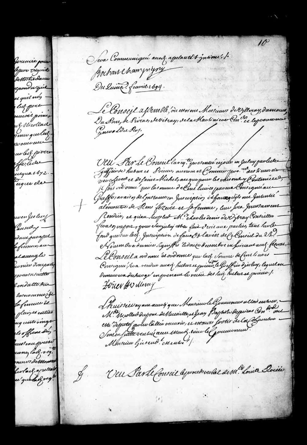 - Transcription du texte avec orthographe modernisée : «Vu par le Conseil le procès-verbal de Monsieur Louis Rouer de Villeray premier conseiller en icelui, du dix de ce mois, contenant l'avis des personnes, y dénoncées pour l'élection d'un subrogé tuteur à Jean Hugues Cochran enfant mineur de défunt Hugues Cochran de Floridor, et de Marie Ursule Phelipeaux sa veuve, et la nomination faite de René Hubert huissier en ce Conseil pour cet effet; et ouï Jean Soulard arquebusier du Roi en cette ville, ensemble ladite veuve Cochran de Floridor, la veuve René Senard et ledit Hubert, et ledit conseiller commissaire en son rapport; le Conseil a ordonné et ordonne que ledit Hubert demeurera subrogé tuteur dudit mineur, lequel Hubert pour ce présent a volontairement accepté ladite charge, promis faire son devoir en icelle, et fait le serment; que ledit Soulard lui communiquera son compte et pièces justificatives d'icelui en la manière qu'il fût ordonné être fait à Lucien Boutteville par arrêt du premier de ce mois, pour donner par ladite veuve Cochran et subrogé tuteur tels débats que bon leur semblera, suivant l'arrêt du vingt-deuxième décembre dernier, auquel subrogé tuteur sera payé salaire raisonnable et par avance la somme de trente livres, et dans la suite ce que ledit conseiller commissaire ordonnera, à avancer par ledit Soulard, sauf à répéter si faire se doit sur les biens de la communauté desdits défunts Cochran et sa veuve. BOCHART CHAMPIGNY ROUER DE VILLERAY.»