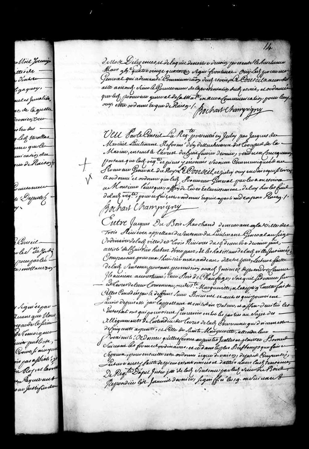 Transcription du texte avec orthographe modernisée : «Vu par le Conseil la requête présentée en icelui par Jacques de Mareuil lieutenant reformé d'un détachement des troupes de la marine, ensemble l'arrêt du huit février dernier, rendu en conséquence, portant que ladite requête et pièces y énoncées seraient communiquées au procureur général du Roi: le Conseil, et icelui ouï en son réquisitoire, a ordonné et ordonne que ledit procureur général parlera ou écrira à Monsieur l'évêque, afin de Tirer éclaircissement de lui sur les fins de ladite requête, pour ce fait, être ordonné ce qu'il appartiendra par raison. BOCHART CHAMPIGNY.»