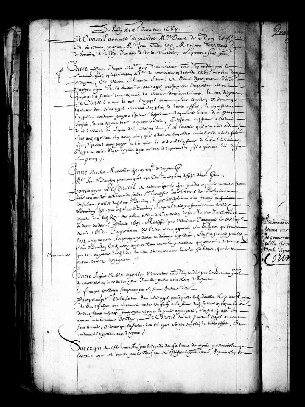 Arrêt qui taxe le prix de vente du vin de Bordeaux à 24 sols le pot, en réponse à la requête du syndic des habitants, 19 décembre 1667, Archives nationales à Québec, Fonds Conseil souverain, (03Q,TP1,S28,P562).