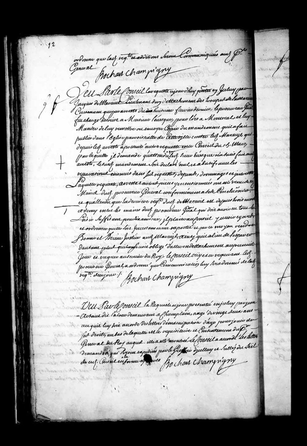 - Transcription du texte avec orthographe modernisée : «Vu par le Conseil la requête ce jourd'hui présentée en icelui par Jacques de Mareuil lieutenant d'un détachement des troupes de la marine contenant que par arrêts du huitième février dernier, le procureur général fut chargé d'écrire à Monsieur l'évêque, pour lors à Montréal, et lui mander de lui remettre ou envoyer copie du mandement qu'il a fait publier dans l'église paroissiale de cette ville contre ledit Mareuil, qui depuis ledit arrêt a présenté autre requête en ce Conseil du 15 mars, par laquelle il demande qu'attendu que ledit sieur évêque n'a satisfait audit arrêt, le susdits mandement soit déclaré nul et abusif, avec les réparations énoncées dans ses requêtes, dépens, dommages et intérêts, laquelle requête, arrêt et autre pièces y mentionnées ont été remis en les mains dudit procureur général conformément à ses conclusions et qu'attendu que la dernière requête dudit de Mareuil est depuis trois mois et demi entre les mains dudit procureur général qui doit avoir eu tout le loisir suffisant pour l'examiner, il plaise au Conseil y avoir égard, et ordonner qu'elle soit incessamment rapportée et par ce moyen rendre bonne et brève justice audit Mareuil, ainsi qu'il a lieu de l'espérer d'autant plus qu'il se voit obligé d'aller en détachement au premier jour et vaquer au service du Roi: le Conseil ouï et ce requérant ledit procureur général, a ordonné que communication lui sera donnée de ladite requête de ce jour. BOCHART CHAMPIGNY.»
