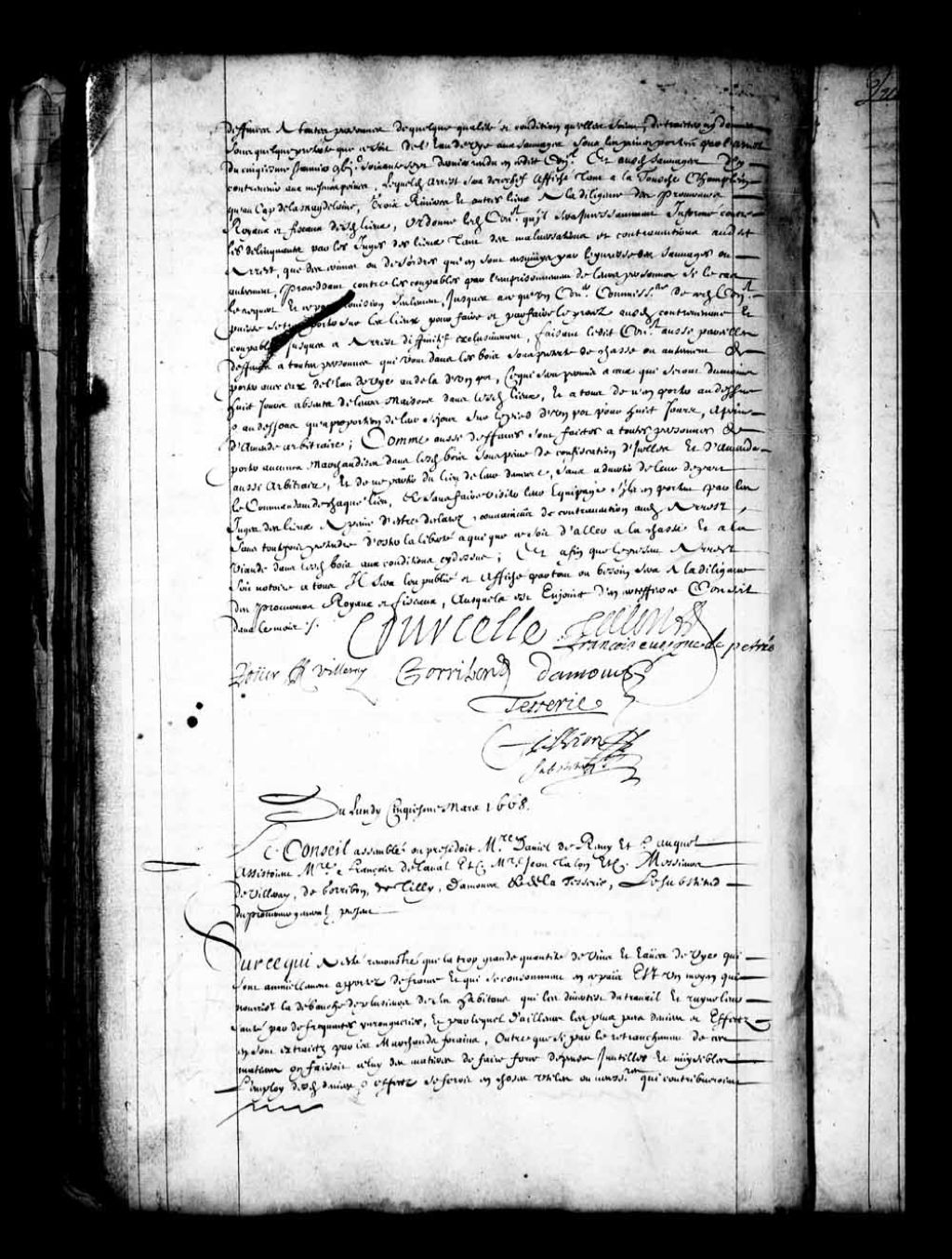 Transcription du texte avec orthographe modernisée : «Du lundi cinquième mars 1668. Le Conseil assemblé où présidait messire Daniel de Rémy etc auquel assistait messire François de Laval etc. messire Jean Talon etc. messieurs de Villeray de Gorribon, de Tilly Damours et de la Tesserie le substitut du procureur général présent. Sur ce qui a été remontré que la trop grande quantité de vins et eaux-de-vie qui sont annuellement apportés de France et qui se consomment en ce pays est un moyen qui nourrit la débauche de plusieurs de ses habitants qui les diverti du travail et ruine leur santé par de fréquentes ivrogneries et par lequel d'ailleurs les plus purs deniers et effets en sont extraits par les marchands forains, outre que si par le retranchement de ces matières on faisait celui des matières de faire force dépense inutile et nuisibles l'emploi desdits deniers et effets se ferait en choses utiles ou nécessaires qui contribueraient à l [...]
