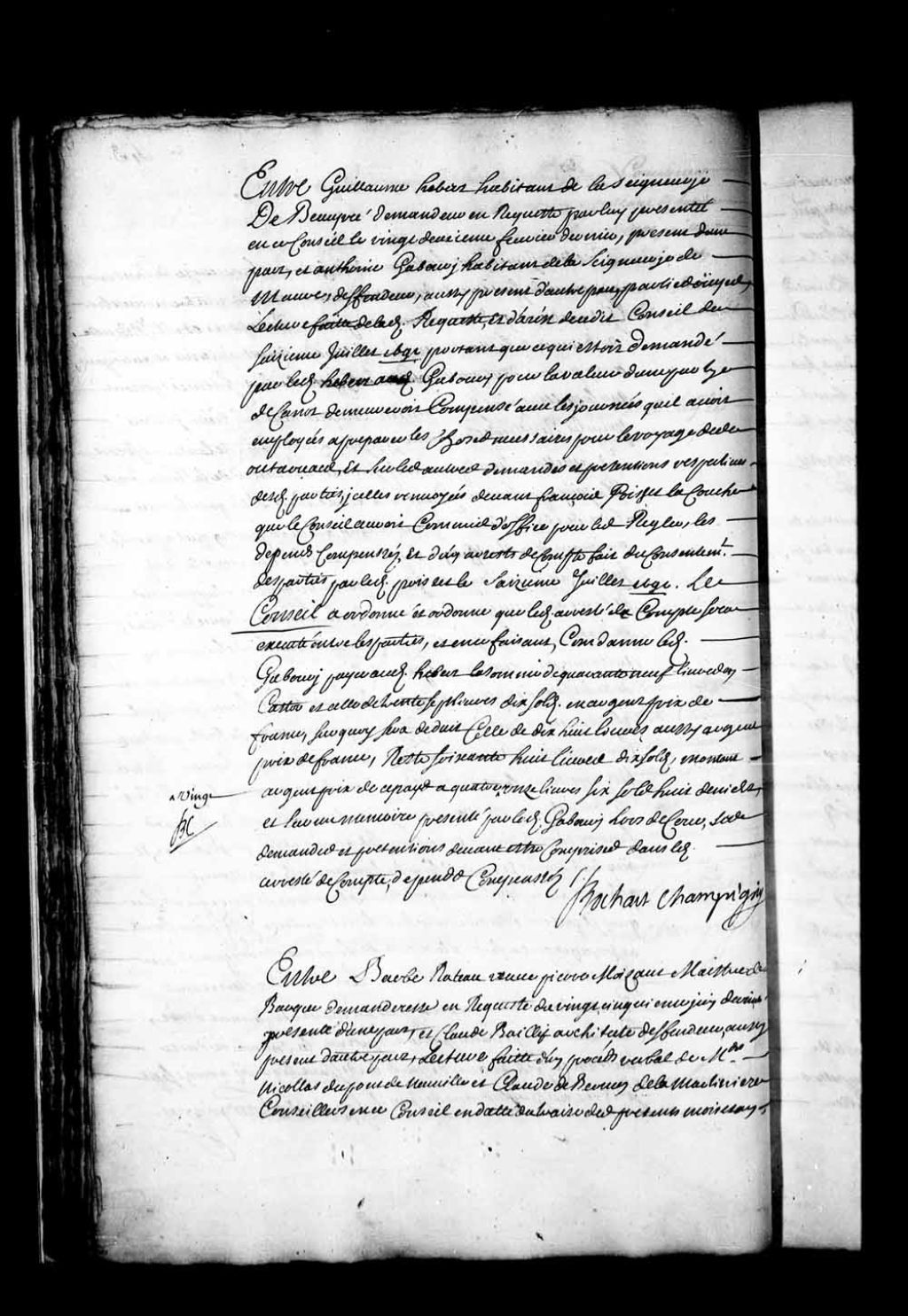 - Transcription du texte avec orthographe modernisée : «Entre Barbe RATEAU veuve Pierre Moisan maître de barque demanderesse en requête du vingt-cinquième juin dernier présente d'une part, et Claude Bailly architecte défendeur, aussi présent d'autre part, lecture faite d'un procès verbal de maîtres Nicolas Dupont de Neuville et Claude de Bermen de la Martinière conseillers en ce Conseil en date du treize des présents mois et an, portant entre autres choses que les parties sont convenues en leur présence, que ledit Bailli parachèvera bien et dûment ce qui reste à faire de la maison sise vers Lafontaine Champlain, dépendant de la communauté dudit défunt et de sa dite veuve, conformément à son entreprise et marché, pour le travail en être fait et parfait au vingt-septembre prochain, à peine de tous dépens dommages et intérêts, à la charge par ladite Rateau de payer audit Bailli, ce qui lui reste à payer de la somme de trois mille livres, après la perfection dudit travail, à prendre et percevoir tous les ans, jusqu'à parfait payement sur les loyers de ladite maison, dans laquelle ladite Rateau aura son logement avec sa famille à sa commodité, le surplus par convention expresse sera loué, le prix de ladite location tournant au profit dudit Bailli préférablement à tous autres, en diminution de ce que dit est, sans qu'il soit obligé de prendre le soin de chercher, ni de pourvoir de locataires, dont il est des à présent déchargé par ladite rateau, le premier payement commençant dudit jour vingtième septembre prochain en deux ans, ainsi que l'intérêt de ce qui restera à payer audit temps de ladite somme de trois mille livres au taux de l'ordonnance, lequel intérêt diminuera à proportion des payements qui auront été faits, qui seront imputés au principal, au moyen de quoi ladite Rateau a déchargé et décharge ledit Bailli des poutres par elle demandées et autres dédommagements de mal façons par elle prétendues de maçonne charpente, menuiserie, que généralement de toutes choses pour les qu'elles les parties auraient été en involution de procès visités ci-devant ordonnés et faites desdits travaux, se contentant ladite Rateau de la structure de ladite maison, en l'état qu'elle est, et sans autre visite, sinon celle de ce qui est à faire, si besoin était en exécution dudit marché, le tout sans aucuns dépens dommages et intérêts de part et d'autre pour le passé, iceux compensés dont les parties auraient requis acte audit commissaires, et qu'il plût à ce Conseil pour leur sûreté homologuer ledit accommodement, étant tombés d'accord que pour en obtenir arrêt de leur consentement, elles se trouveraient ce jour en ce dit Conseil sans assignations. Ouï lesdites parties et de leur consentement, le Conseil a homologué et homologue ledit accord, pour être suivi et exécuté entre lesdites parties selon sa forme et teneur. BOCHART CHAMPIGNY.»