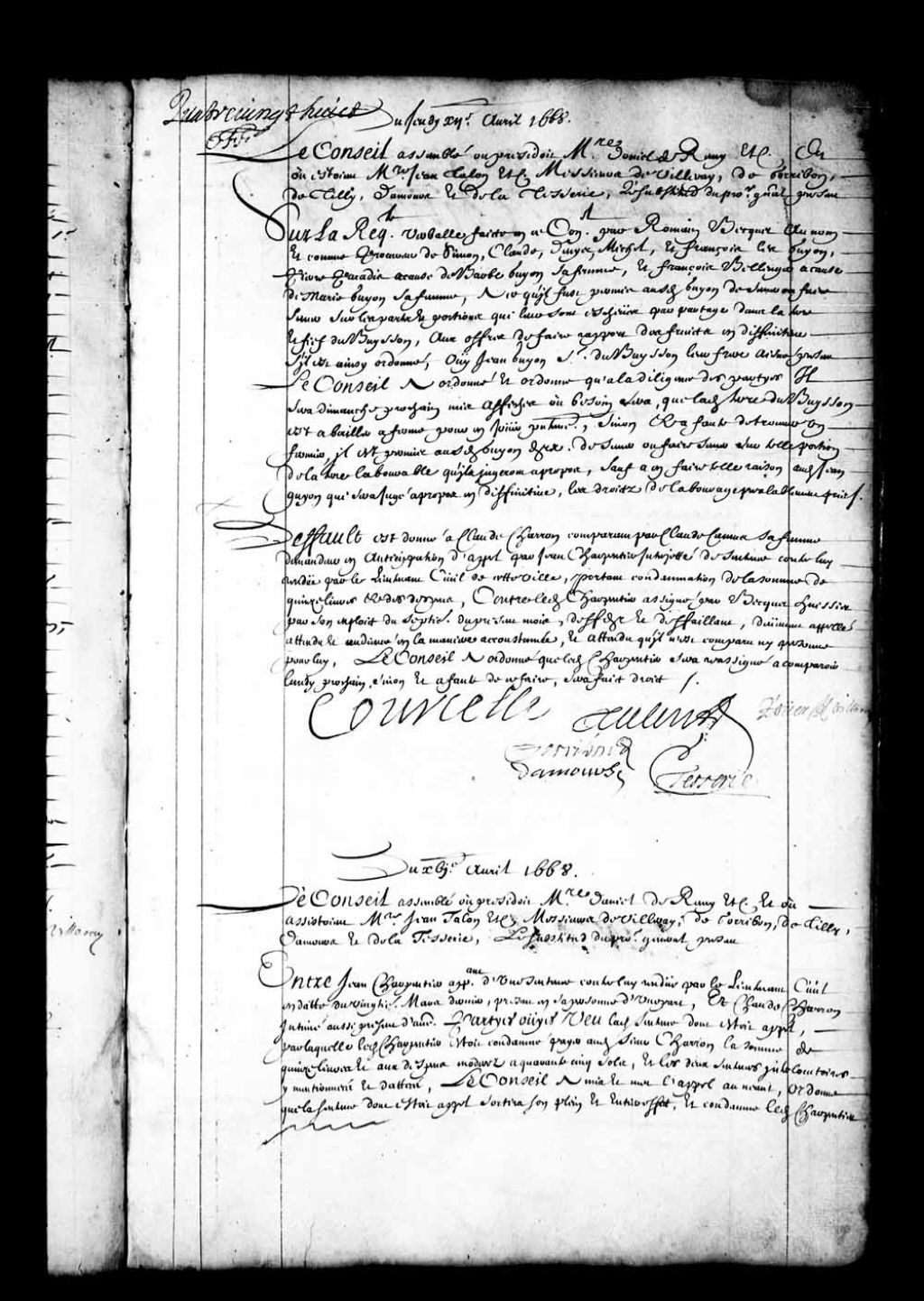 - Transcription du texte avec orthographe modernisée : «Du jeudi 12e avril 1668. Le Conseil assemblé où présidait messire Daniel de Rémy etc, et où étaient messire Jean Talon etc, Messieurs de Villeray de Gorribon, de Tilly Damours et de la Tesserie, le substitut du procureur général présent. Sur la requête verbale faite en ce Conseil par Romain Becquet au nom et comme procureur de Simon, Claude, Denys, Michel, et François les Guyon, Pierre Paradis à cause de Barbe Guyon sa femme et François Bellenger à cause de Marie Guyon sa femme à ce qu'il fût permis auxdits Guyon de semer ou faire semer sur les parts et portions qui leur sont échues par partage dans la terre et fief Dubuisson aux offres de faire rapport des fruits en définitive s'il est ainsi ordonné ouï Jean Guyon sieur Dubuisson leur frère aîné présent, le Conseil a ordonné et ordonne qu'à la diligence des parties il sera dimanche prochain mis affiches où besoin sera, que ladite [...]