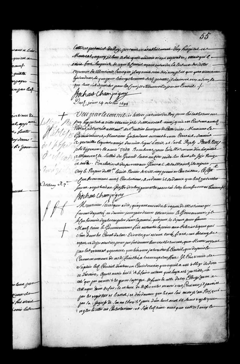 - Transcription du texte avec orthographe modernisée : «Monsieur l'évêque a dit, qu'ayant entendu le rapport de Messieurs qui furent députés au dernier jour par devers Monsieur le gouverneur, il se confirmait de plus en plus dans la pensée, qu'après son départ pour France. Mondit sieur le gouverneur fît ressentir sa peine aux ecclésiastiques qui sont dans les cures de son Diocèse, qui étant curés fixes, ont besoin de repos et de protection, pour perfectionner leur établissement, que même voyant par les mêmes réponses, que l'on veut intéresser le Conseil, qui depuis le commencement de ces difficultés a beaucoup souffert: il continue de supplier ledit Conseil d'entrer en considération que ce qu'il a été obligé de dire et d'écrire, après avoir évité de le faire autant qu'il lui a été possible, n'a été que par nécessité et pour sa propre défense et celle de son clergé, qu'on a attaqué tant de fois, et en tant de différentes manières, comme il paraît par les registres et liasses; et d'ordonner que le tout soit envoyé au Roi, qui par sa sagesse et son autorité peut d'un seul mot et sans réplique régler toutes ces contestations, et s'est ledit sieur évêque retiré; ouï le procureur général du Roi. Le Conseil a ordonné et ordonne que ledit procureur général, ce requérant, aura communication, de l'écrit de Monsieur le gouverneur, des réponses de Monsieur l'évêque, et de tout ce qui les concerne, pour ce fait, et sur réquisitoire ou conclusions vues, être ordonné ce que de raison. BOCHART CHAMPIGNY.»