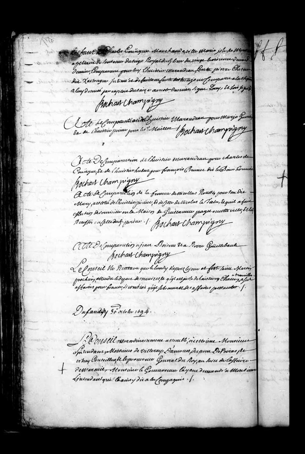 Acte de comparution donné au huissier Marandeau pour Marie Guertin et au huissier Pieur pour le sieur Maillot, 18 octobre 1694, Archives nationales à Québec, Fonds Conseil souverain, (03Q,TP1,S28,P5730).