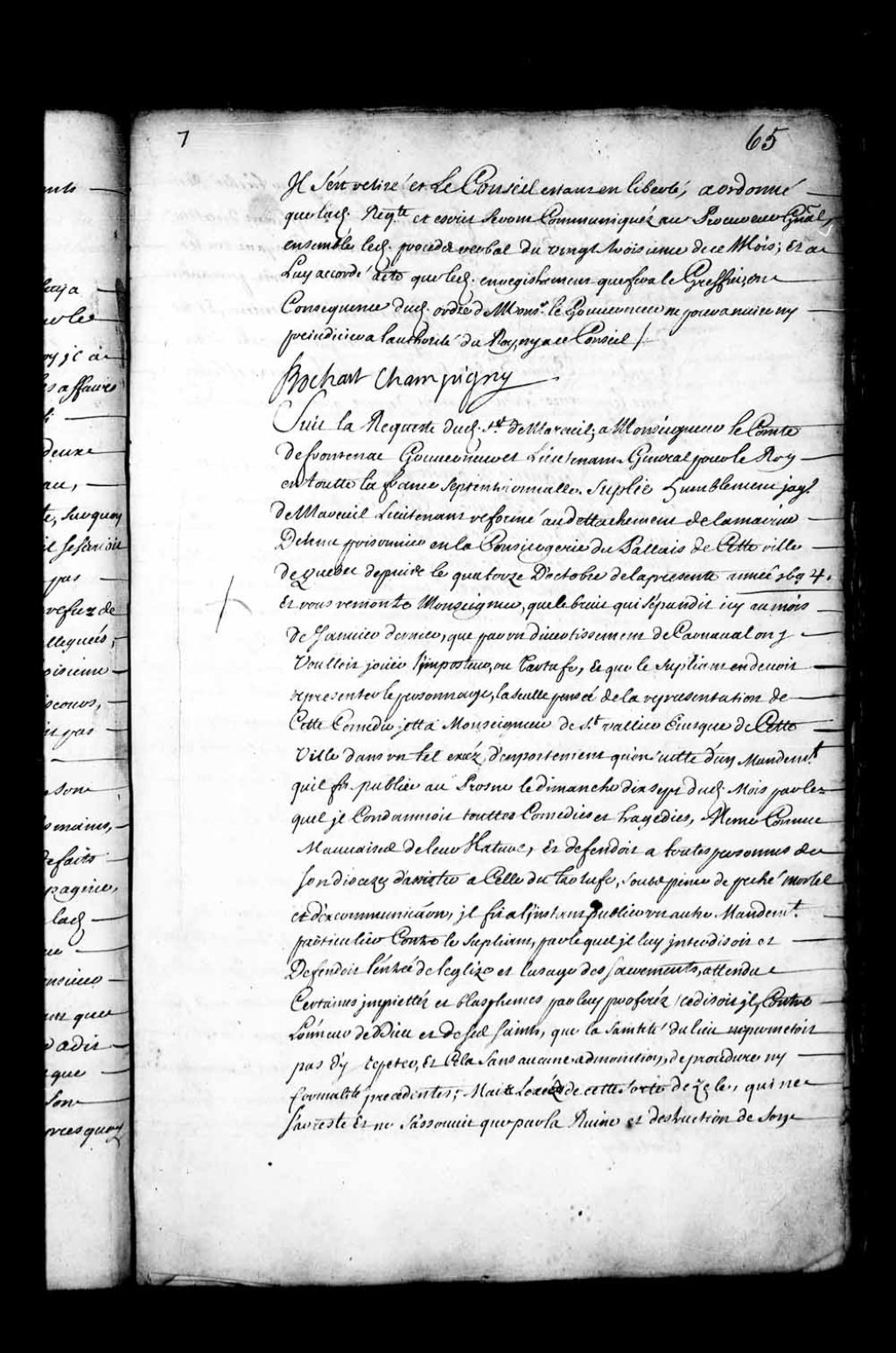 - Transcription du texte avec orthographe modernisée : «Suit la requête dudit sieur de Mareuil à Monseigneur le comte de Frontenac gouverneur et lieutenant général pour le Roi en toute la France septentrionale. Supplie humblement Jacques de Mareuil lieutenant reformé au détachement de la marine détenu prisonnier en la conciergerie du palais de cette ville de Québec depuis le quatorze d'octobre de la présente année 1694. Et vous remontre Monseigneur, que le bruit qui s'épandit ici au mois de janvier dernier, que par un divertissement de carnaval on y voulait jouer l'imposteur, ou Tartufe (Tartuffe), et que le suppliant en devait représenter le personnage, la seule pensée de la représentation de cette comédie jeta Monseigneur de Saint-Vallier évêque de cette ville dans un tel excès d'emportement qu'ensuite d'un mandement qu'il fît publier au Prône le dimanche dix-sept dudit mois par lequel il condamnait toutes comédies et tragédies, même comme mauvaises de leur Nature, et défendait à toutes personnes de son diocèse d'assister à celle du Tartufe, sous peine de péché mortel et d'excommunication, il fit à l'instant publier un autre mandement particulier contre le suppliant, par lequel il lui interdisait et défendait l'entrée de l'église et l'usage des sacrements, attendu certaines impiétés et blasphèmes par lui proférés, ce disait il, contre l'honneur de Dieu et de ses Saints; que la Sainteté du lieu ne permettait pas d'y répéter, et cela sans aucune admonition, de procédure ni formalité précédentes; mais l'excès de cette sorte de zèle, qui ne s'arrête et ne s'assouvit que par la ruine et destruction de son objet, n'a jusqu'ici rien omis ni épargné pour tâcher d'en venir à sa fin, qui est de faire paraître le suppliant directement coupable du crime de lèse-majesté divine, car ayant vu les poursuites et sommations que le suppliant faisait pour avoir copie dudit calomnieux et diffamatoire mandement, et les diverses requêtes qu'il avait présentées pour en être reçu appelant comme d'abus Et qu'on avait toujours éludés, dans l'espérance qu'on lui avait donnée qu'on accommoderait l'affaire. Mondit seigneur de Québec par une intrigue et cabale avec Monsieur le procureur général affecta de prévenir ledit appel et d'aller dénoncer le suppliant au Conseil le premier jour de février et de demander qu'il fût informé contre lui à la requête dudit sieur procureur général, lequel se déclara à l'instant sa partie et requît ladite information, sans demander aucune communication dudit mandement, ni des dénonciations que ledit seigneur évêque disait avoir, et firent tous deux si bien en sorte, que Monsieur de Villeray, ennemi du suppliant, fut nommé sur le champ commissaire, pour faire ladite information, et ce nonobstant qu'il se défendît de l'être, à cause des sujets de récusation qu'il avoua lors, que le suppliant avait contre lui; mais la faveur dudit seigneur évêque l'emportant sur les bons mouvements de sa conscience, il consentit enfin à ladite commission. Cependant le suppliant qui ne savait point toutes ces pratiques voyant le refus ouvert que Monseigneur de Québec faisait à toutes ses sommations, de donner copie dudit mandement, forma ledit appel comme d'abus par sa requête au Conseil le huit dudit mois de février, demandant qu'il fût ordonné que copie dudit mandement lui serait donné, sur laquelle requête, arrêt fut rendu qu'elle serait communiquée avec les pièces énoncées en icelle audit sieur procureur général sans lui faire rien connaître de la procédure commencée contre lui. Ensuite de ce, ledit suppliant présenta plusieurs requêtes inutilement par les prolongations et retardements dudit sieur procureur général, qui entre autres en a gardé une depuis le quinze de mars jusqu'au quatorze d'octobre dernier qu'il la remit sur le bureau, et qu'il obtint arrêt conformément à ses conclusions pour faire emprisonner le suppliant comme il fit le même jour. ce fut par la signification de cet arrêt que ledit suppliant apprit lors les informations faites par Monsieur de Villeray comme commissaire en cette partie, pourquoi il refusa de répondre à l'interrogatoire qu'il lui voulut faire le second jour suivant, pour les causes de récusation qu'il lui déclara avoir contre lui, et ensuite fournir d'abondant de Nouveaux moyens de récusation le dix-huit dudit mois, par une requête, laquelle Monsieur le procureur général refusa à l'huissier Roger de mettre sur le bureau disant que quand on parlerait de cette affaire, il le ferait entrer, et cela pourtant pendant que sur le procès-verbal d'interrogatoire dudit sieur de Villeray, le Conseil ordonnait qu'il serait passé outre tellement que cet arrêt dudit jour dix-huit octobre étant ainsi surpris par ledit sieur procureur général, ledit sieur de Villeray vint derechef pour interroger le suppliant, qui d'abondant lui refusa de répondre jusqu'à ce qu'il eût été statué sur sa dite requête de récusation. cette requête fut enfin mise sur le bureau le trentième du même mois d'octobre, et le Conseil ordonna qu'elle serait communiquée audit sieur de Villeray pour y répondre, comme il fit par un écrit, dont toute la prolixité ne disait rien sur les trois principaux chefs de ladite récusation dont l'un regarde les menaces desquelles il s'est plaint à vous-mêmes Monseigneur lui avoir été faites par le suppliant, et les deux autres concernent deux articles de l'ordonnance qui de droit excluent ledit sieur commissaire de l'être, voulant qu'il en soit commis un autre suivant l'ordre du tableau, aux qu'elles réponses ledit suppliant a fourni ses répliques qui prouvent par raisons solides et incontestables que lesdites récusations sont admissibles et bien fondées le tout fut communiqué audit sieur procureur général conformément audit arrêt: nonobstant quoi il en a obtenu un autre du dix-huit du présent mois de novembre, p