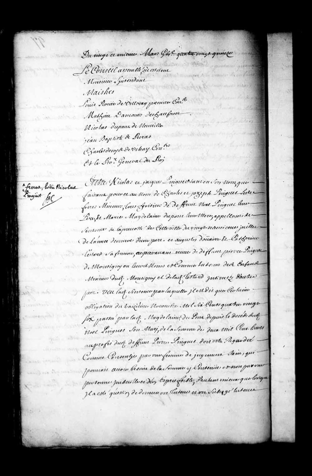 Transcription du texte avec orthographe modernisée : «Du vingt et unième mars mille six cent quatre-vingt-quinze. Le Conseil assemblé, où étaient Monsieur l'intendant. Maîtres Louis Rouer de Villeray premier conseiller. Mathieu Damours Dechaufour. Nicolas Dupont de Neuville. Jean-Baptiste Depeiras. Charles Denys de Vitray conseillers. Et le procureur général du Roi. Entre Nicolas et Jacques PINGUET frères, ledit Nicolas Pinguet tant en son nom, que faisant pour et au nom de Charles et Joseph Pinguet ses mineurs, tous héritiers de défunt Noël Pinguet leur père, et Marie Madeleine Dupont leur mère, appelants de sentence de la prévôté de cette ville du vingt neuvième juillet de l'année dernière d'une part. Et Augustin DOUAIRE et Catherine TESTARD sa femme, auparavant veuve de défunt Pierre Pinguet de Montigny en leurs noms et comme tuteurs des enfants mineurs dudit Montigny et de ladite Testard intimés d'autre part. Vu ladite sentence par [...]