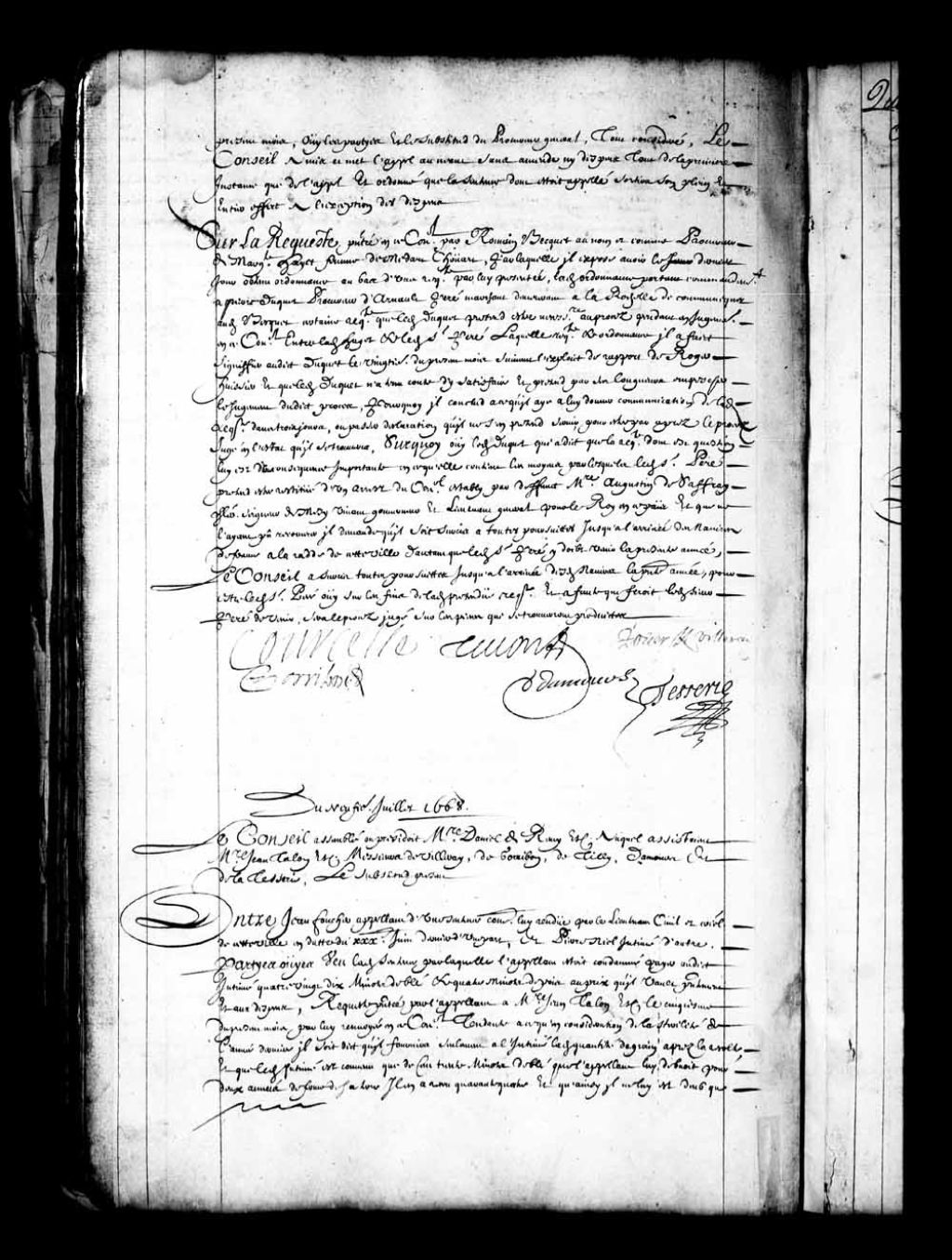 - Transcription du texte avec orthographe modernisée : «Sur la requête présentée en ce Conseil par Romain Becquet au nom et comme procureur de Marguerite Hayot femme de Médard Chouart par laquelle il expose avoir le dernier jour obtenu ordonnance au bas d'une requête par lui présentée, ladite ordonnance portant commandement à Pierre Duquet procureur de Arnaud Perré marchand demeurant à La Rochelle de communiquer audit Becquet certaine requête que ledit Duquet prétend être nécessaire au procès pendant en jugement en ce Conseil entre ladite Hayot et ledit sieur Perré, laquelle requête et ordonnance il a fait signifier audit Duquet le vingtième du présent mois suivant l'exploit de rapport de Roger huissier et que ledit Duquet n'a tenu compte d'y satisfaire et prétend par ses longueurs empêcher le jugement dudit procès, pour quoi il conclu à ce qu'il ait à lui donner communication de ladite requête dans trois jours ou passer déclaration qu'il ne s'en prétend servir pour être par après le procès jugé en l'état qu'il se trouvera, sur quoi ouï ledit Duquet qui a dit que la requête dont est question lui est d'une conséquence importante en ce qu'elle contient les moyens par lesquels ledit sieur Perré prétend être restitué d'un arrêt du Conseil établi par défunt messire Augustin de Saffray chevalier seigneur de Mésy vivant gouverneur et lieutenant général pour le Roi en ce pays et que ne l'ayant pu recouvrer il demande qu'il soit sursis à toutes poursuites jusqu'à l'arrivée des navires de France à la rade de cette ville d'autant que ledit sieur Perré y doit venir la présente année, Le Conseil a sursis toutes poursuites jusqu'à l'arrivée desdits navires la présente année pour être ledit sieur Perré ouï sur les fins de ladite prétendue requête et à faute que ferait ledit sieur Perré de venir, sera le procès jugé sur les pièces qui se trouveront produites. COURCELLE TALON, ROUER DE VILLERAY GORRIBON, DAMOURS TESSERIE.»