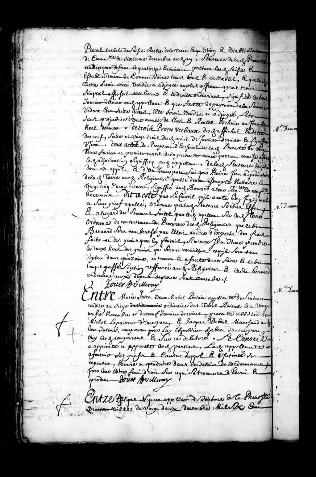 - Transcription du texte avec orthographe modernisée : «Monsieur Damours président. Entre Philippe Neveu appelant de sentence de la prévôté de cette ville du vingt-deux décembre mille six cent quatre-vingt-dix en ce que l'intimé ci-après nommé a été renvoyé absous de la demande à lui faite au sujet de l'achat et payement de moitié de Pignon dont il se sert, et pour autres torts et griefs à lui faits, présent d'une part, et Jean SOULARD intimé aussi présent d'autre part, ouï lesdites parties et sur ce délibéré. Le Conseil à icelles appointées à fournir par l'appelant ses causes d'appel, écrire et produire dans les délais de l'ordonnance pour au rapport de maître Charles Denys de Vitray leur être fait droit.»