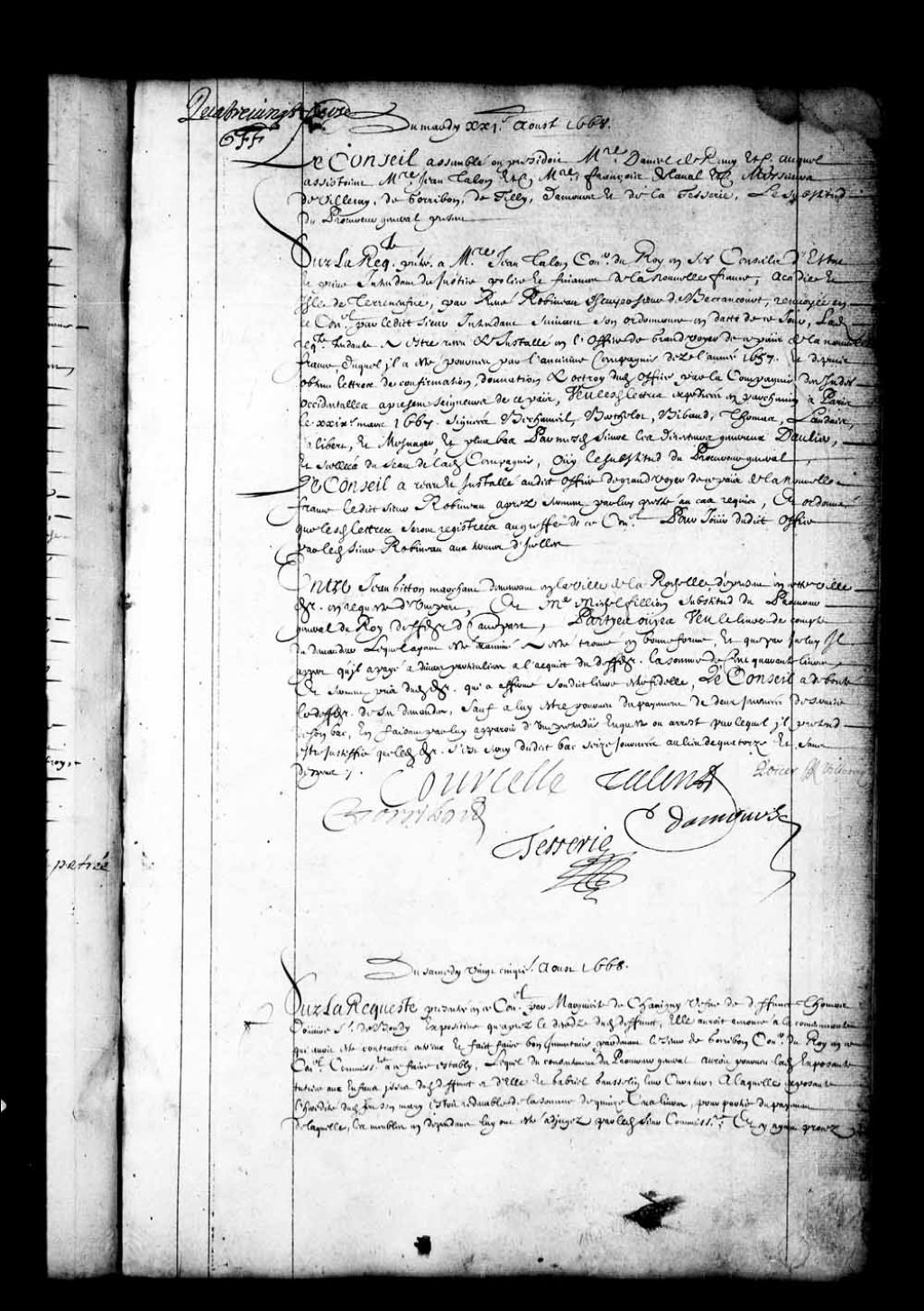 - Arrêt déboutant Jean Giton (Gitton), marchand de la ville de La Rochelle de sa demande contre maître Michel Fillion, substitut du procureur général, sauf à être pourvu de deux jours de service du bac (bateau) de Fillion