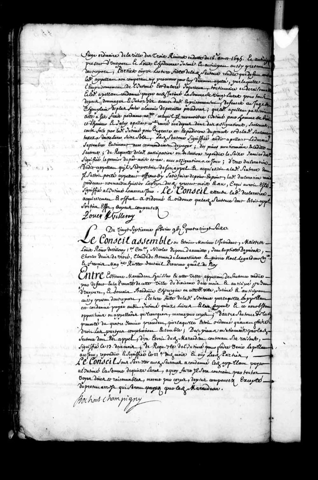 Transcription du texte avec orthographe modernisée : «Du vingt-septième février mille six cent quatre-vingt-seize. Le Conseil assemblé où étaient Monsieur l'intendant, maîtres Louis Rouer de Villeray, premier conseiller, Nicolas Dupont de Neuville, Jean-Baptiste Depeiras, Charles Denys de Vitré, Claude de Bermen de la Martinière et Pierre Noël Legardeur conseillers et François Madeleine Ruette d'Auteuil procureur général du Roi. Entre Etienne MARANDEAU huissier en cette ville appelant de sentence rendue par défaut en la prévôté de cette ville du dixième de ce mois et anticipé présent d'une part, et Gervais BAUDOUIN chirurgien en cette dite ville, intimé et anticipant aussi présent d'autre part, lecture faite de ladite sentence par laquelle l'appelant est condamné payer audit intimé quinze livres et les dépens et ce nonobstant oppositions ou appellations quelconques, même par corps; d'autre sentence de ladite prévôté du quatre janvier précédent, par laquelle était ordonné qu'avant faire droit les parties compteraient ensemble; des pièces mentionnées par ladite sentence dont est appel; d'un écrit dudit Marandeau contenant ses raisons, signifié le 13 de ce mois; de requête de l'intimé pour faire venir l'appelant à ce jour, répondue et signifiée le 22e dudit mois et ouï lesdites parties, le Conseil sans s'arrêter aux dites sentences a condamné ledit appelant payer à l'intimé la somme de quinze livres, à quoi faire il sera contraint par toutes voies dues et raisonnables, même par corps, dépens compensés excepté du présent arrêt qui seront payés par ledit Marandeau. BOCHART CHAMPIGNY.»