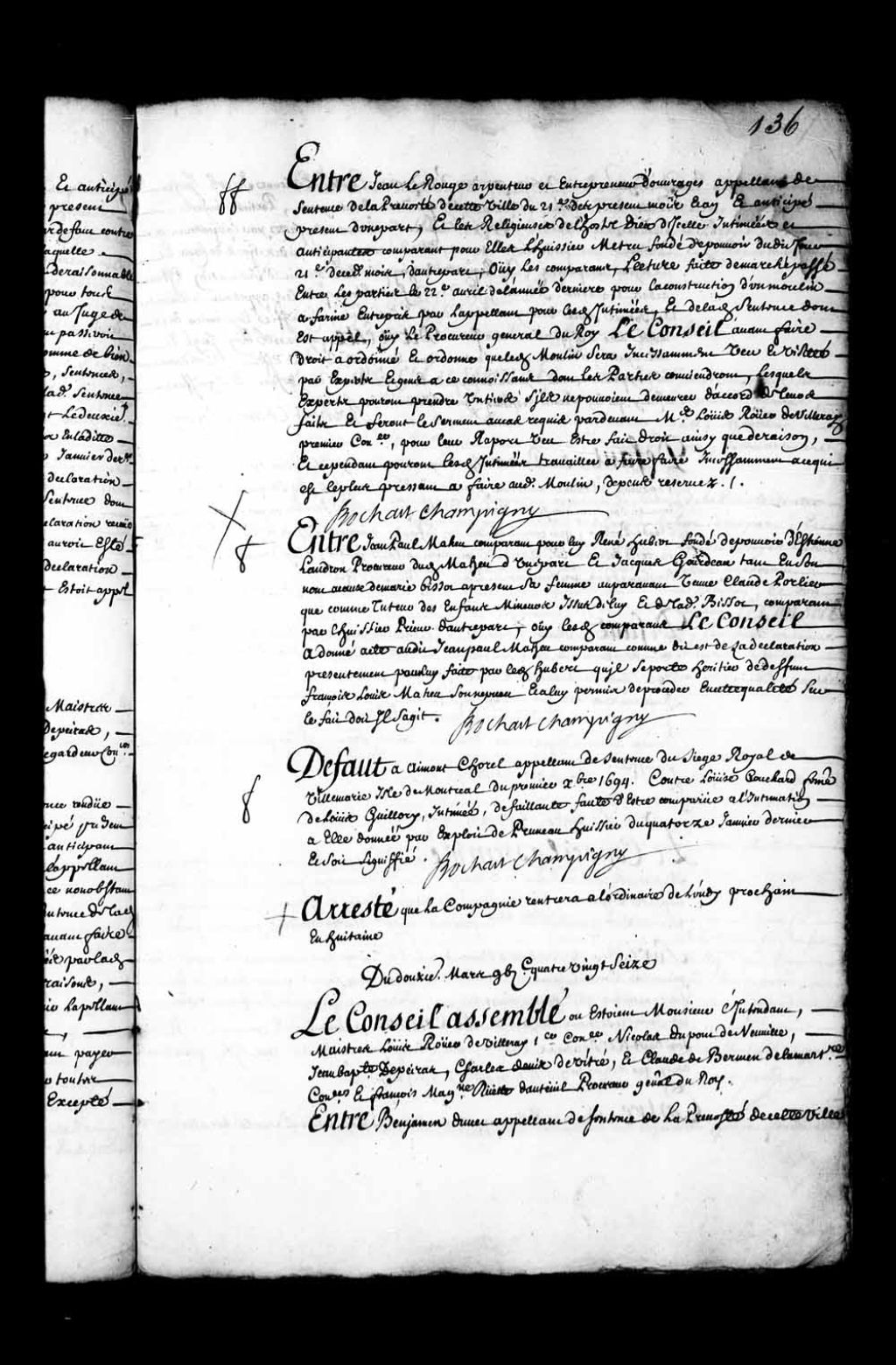 - Transcription du texte avec orthographe modernisée : «Entre Jean le Rouge arpenteur et entrepreneur d'ouvrages appelant de sentence de la prévôté de cette ville du 21e des présent mois et an et anticipé présent d'une part, et les religieuses de l'Hôtel-Dieu d'icelle intimées et anticipantes comparant pour elles l'huissier Metru fondé de pouvoir dudit jour 21e de ce dit mois, d'autre part, ouï les comparants, lecture faite de marché passé entre les parties le 29e avril de l'année dernière pour la construction d'un moulin a farine entrepris par l'appelant pour lesdites intimées, et de ladite sentence dont est appel, ouï le procureur général du Roi. Le Conseil avant faire droit a ordonné et ordonne que ledit moulin sera incessamment vu et visité par experts et gens à ce connaissant dont les parties conviendront, lesquels experts pourront prendre un tiers s'ils ne pouvaient demeurer d'accord de leurs faits et feront le serment au cas requis par-devant maître Louis Rouer de Villeray premier conseiller, pour leur rapport vu être fait droit ainsi que de raison, et cependant pourront lesdites intimées travailler à faire faire incessamment à ce qui est le plus pressant à faire audit moulin, dépens réservés. BOCHART CHAMPIGNY.»