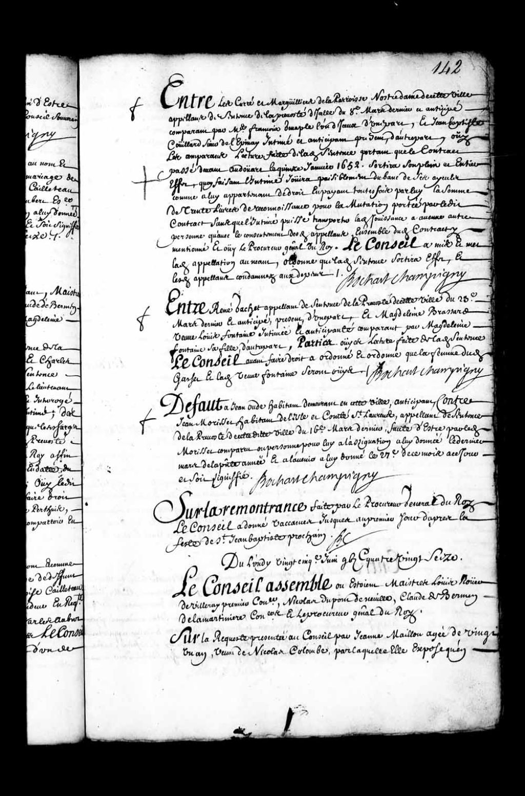 Transcription du texte avec orthographe modernisée : «Défaut à Jean Oude habitant demeurant en cette ville, anticipant, contre Jean Morisset habitant de l'île et comté Saint-Laurent, appelant de sentence de la prévôté de cette dite ville du 16e mars dernier, faute d'être par ledit Morisset comparu ou personne pour lui à l'assignation à lui donnée le dernier mars de la présente année et à l'avenir à lui donné le 27e de ce mois à ce jour et soit signifié. BOCHART CHAMPIGNY.»