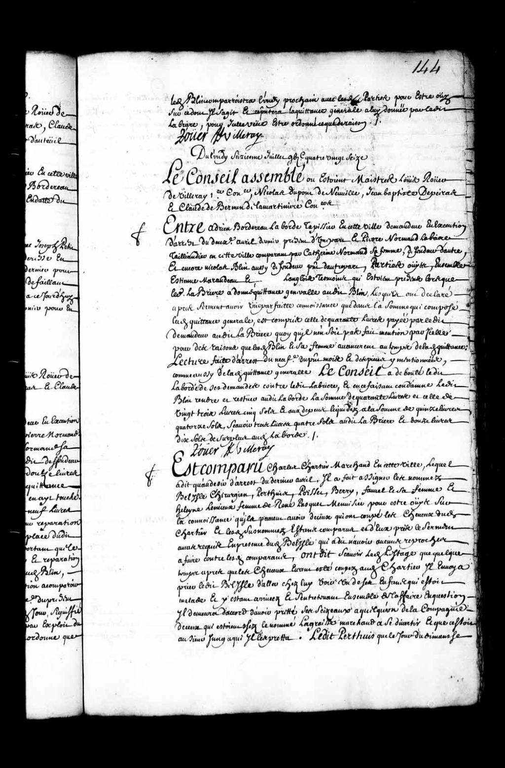 Transcription du texte avec orthographe modernisée : «Est comparu Charles Chartier marchand en cette ville, lequel a dit qu'au désir d'arrêt du dernier avril, il a fait assigner les nommés Belisle chirurgien, Perthuis, Poisset, Berry, fauvel et sa femme et Hélène (Heleyne) Lemieux femme de René Pasquet (Paquet) menuisier, pour être ouïs sur la connaissance qu'ils peuvent avoir de ceux qui ont coupé les cheveux dudit Chartier et lesdits sus-nommés étant comparus et d'eux pris le serment au cas requis en présence dudit Belisle qui a dit n'avoir aucuns reproches à faire contre lesdits comparants, ont dit savoir ledit Lestage que quelque temps après que les cheveux eurent été coupés audit Chartier il envoya prier ledit Belisle d'aller chez lui voir un de ses enfants qui était malade et y étant arrivés et s'entretenant ensemble de l'affaire en question il demeura d'accord d'avoir prêté ses ciseaux à quelqu'un de la compagnie de ceux qui étaient chez le nommé Lagraisse marchand à se divertir et que c'était au sieur Jung à qui il les prêta. Ledit Perthuis que le jour du dimanche gras étant à déjeuner chez lui avec les nommés Berry et Gaillard marchand et s'entretenant aussi sur le même sujet, lui Perthuis envoya par curiosité son garçon prier ledit Belisle de venir chez lui pour en tirer quelque connaissance étant arrivé et entré dans un cabinet ou lui Perthuis le tira a part, il lui avoua qu'il avait prêté ses ciseaux au sieur Jung et qu'ensuite étant entré dans la chambre ou Ils déjeunaient et ayant continué de parler desdits ciseaux par manière d'entretien, ledit Belisle dit encore en présence de la compagnie qu'il les avait prêté au sieur Jung ledit Berry a dit que lorsque lesdits Perthuis et Belisle sortirent du cabinet ledit Perthuis dit que ce n'était point un autre que ledit Jung qui avait coupé les cheveux dudit Chartier et que même ledit Belisle demeura d'accord de lui avoir prêté les ciseaux, ce qu'il répéta deux ou trois fois. Et ledit Belisle présent a dit qu'on ne devait ajouter aucune foi à leurs dépositions qui sont contraires à la vérité et que ce sont lesdits L'Estage (Lestage), Perthuis et Berry qui malicieusement ont engagé ledit Chartier à une telle poursuite. Ladite Lemieux femme dudit Pasquet (Paquet) a dit avoir ouï dire à la femme dudit fauvel que c'était ledit Poisset qui avait coupé les cheveux dudit Chartier et à l'égard desdits Fauvel et sa femme qu'ils n'ont aucune connaissance de ce dont il s'agit. Le Conseil a ordonné et ordonne que ledit Jung sera ouï à la diligence dudit Chartier et attendu son absence pour la guerre contre les Iroquois sursis à son retour. ROUER DE VILLERAY.»