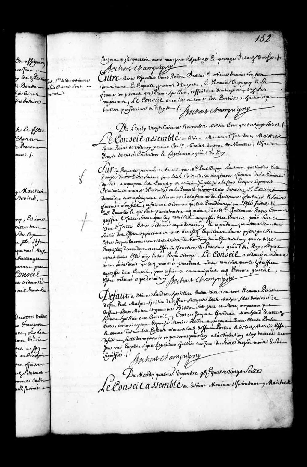 Transcription du texte avec orthographe modernisée : «Défaut à Etienne Landron hôtelier en cette ville au nom et comme procureur de Jean-Paul Maheu héritier de défunt François Louis Maheu fils douairier de défunt Louis Maheu et Geneviève Bissot ses père et mère, comparant par Hubert huissier en ce Conseil, contre Jacques Gourdeau marchand en cette dite ville, comme ayant épousé Marie Bissot auparavant veuve Claude Porlier et comme tuteur; des enfants mineurs dudit défunt Porlier et de ladite Marie Bissot défaillant faute de comparaître ou personne pour lui à l'assignation à lui donnée à ce jour par exploit signé Lepailleur huissier à ce jour du seize du présent mois et soit signifié. BOCHART CHAMPIGNY.»