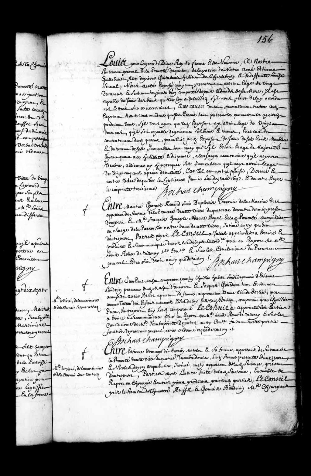 Transcription du texte avec orthographe modernisée : «Mes de Vitré, de la Martinière et de Lachesnais sont rentrés. Entre Etienne DOMINGO dit CARABY matelot et sa femme, appelant de sentence de la prévôté de cette ville du quatrième décembre dernier, ladite femme présente d'une part, et Nicolas DOYON arquebusier, intimé, aussi appelant de ladite sentence, présent d'autre part. Parties ouïes. Lecture faite de ladite sentence, ensemble de rapport en chirurgie et autres pièces produites par lesdites parties, le Conseil pris le serment de Timothée Roussel et Gervais Beaudouin maître chirurgiens sur ledit rapport deux signé après les avoir entendu audit Conseil d'office, et sans s'arrêter à ladite sentence dont est appel, a déchargé ledit doyon de l'action à lui faite et lesdits Caraby et sa femme condamnés aux dépens. BOCHART CHAMPIGNY.»