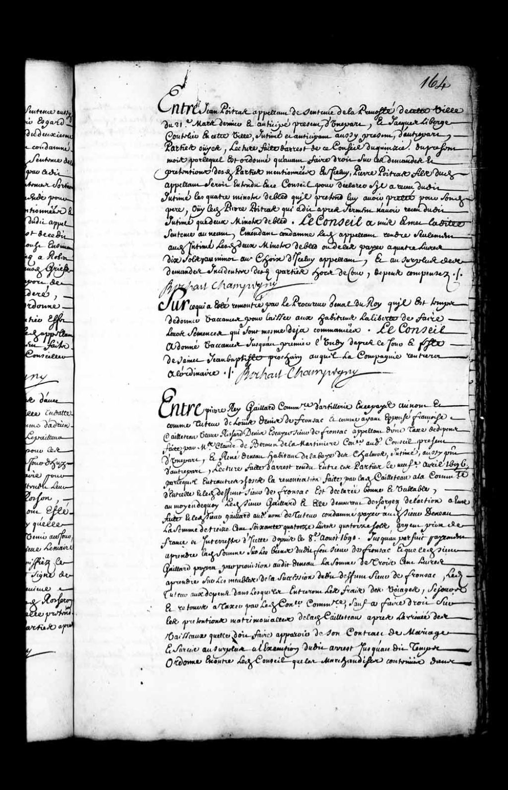 - Transcription du texte avec orthographe modernisée : «Entre Pierre REY GAILLARD commissaire d'artillerie en ce pays au nom et comme tuteur de Louis Denis de Fronsac et comme ayant épousé Françoise Cailleteau veuve Richard Denis écuyer sieur de Fronsac appelant d'une taxe de dépens faite par maître Claude de Bermen de la Martinière conseiller audit Conseil présent d'une part, et René DENEAU habitant de la Baie des Chaleurs, intimé, aussi présent d'autre part, lecture faite d'arrêt rendu entre les parties le neuvième avril 1696 par lequel entre autres choses la renonciation faite par ladite Cailleteau à la communauté d'entre elle et ledit défunt sieur de Fronsac est déclarée bonne et valable, au moyen de quoi ledit sieur Gaillard et elle demeurent déchargés de l'action à eux faite et ledit sieur gaillard audit nom de tuteur condamné payer audit sieur Deneau la somme de treize cent soixante-quatorze livres quatorze sols argent prix de France et intérêts d'icelle depuis le 8e août 1690 jusqu'au parfait payement à prendre ladite somme sur les biens dudit feu sieur de Fronsac et que ledit sieur Gaillard payera par provision audit Deneau la somme de trois cents livres à prendre sur les meubles de la succession dudit défunt sieur de Fronsac, ledit tuteur aux dépens dans lesquels entreront les frais des voyages, séjours et retour à taxer par ledit conseiller commissaire, sauf à faire droit sur les prétentions matrimoniales de ladite Cailleteau après l'arrivée des vaisseaux qu'elle doit faire apparaître de son contrat de mariage et sursis au surplus à l'exécution dudit arrêt jusqu'audit temps ordonne en outre ledit Conseil que les marchandises contenues dans un compte fourni par ledit tuteur audit Deneau seront prises et estimées par le sieur Pachot marchand; de contrat de mariage d'entre ledit feu sieur de Fronsac et ladite Cailleteau passé à La Rochelle devant maître Billot notaire le 22e juillet 1690 de mémoire de frais et dépens présenté par ledit Deneau et débattu par ledit sieur Gaillard taxé par ledit conseiller commissaire à la somme de deux mille soixante-dix-huit livres seize sols sans préjudice de celle de quatorze livres cinq sols adjugée audit Deneau par arrêt du 3e septembre 1691 de trente sols pour l'exécutoire, de quinze sols pour la signification et des intérêts de ladite somme de treize cent soixante-quatorze livres quatorze sols prix de France jusqu'à parfait payement à compter du huitième août 1690. sauf à déduire celle de trois cent quatre-vingt-deux livres dix sols d'une part et celle de trois cents livres d'autre argent prix de ce pays, ladite taxe faite le neuvième mai 1696; des griefs et moyens d'appel dudit Gaillard; réponses dudit Deneau à iceux et après avoir entendu les parties, le Conseil a modéré et modère les frais taxés par ledit conseiller commissaire et autres prétendus par ledit Deneau à la somme de neuf cent trente-cinq livres trois sols et a ordonné et ordonne que ledit sieur Gaillard audit nom payera en outre la somme de dix-huit cent trente-deux livres dix-huit sols huit deniers de principal, sauf à déduire ladite somme de trois cent quatre-vingt-deux livres dix sols suivant le compte taxé par le sieur Pachot le (...) Et celle de trois cents livres conformément à l'arrêt du neuf avril 1696. Et les intérêts de la somme principale à commencer du huitième août 1690. suivant et conformément à l'état qui en a été dressé ce jourd'hui, paraphé et joint au présent arrêt, auquel principal et intérêts ayant joint ladite somme de neuf cent trente-cinq livres trois sols de frais compose celle de deux mille cinq cent soixante-seize livres quinze sols onze deniers laquelle ledit sieur Gaillard audit nom est condamné payer audit Deneau comme il suit, savoir dans la présente année cinq cents livres, l'année prochaine mille livres et pour chacune des autres années suivantes cinq cents livres jusqu'au payement totale de ladite somme ayant été ainsi arrêté audit Conseil suivant les offres du tuteur pour la conservation des propres dudit mineur et empêcher un décret d'iceux que ledit intimé n'aurait pu faire qu'avec de très grands frais attendu la longue distance des lieux et la difficulté d'y aller ordonne en outre à l'égard des intérêts échus jusqu'à ce jour montant suivant ledit état à la somme de quatre cent quatre-vingt-onze livres six sols trois deniers, qu'ils seront acquittés sur le premier payement qui sera fait la présente année de ladite somme de cinq cents livres et que du surplus qui est de onze cent cinquante livres six sols huit deniers qui reste de principal et neuf cent trente-cinq livres trois sols de frais faisant ensemble la somme de deux mille quatre-vingt-cinq livres neuf sols huit deniers, ledit Gaillard audit nom payera de ce jour à l'avenir l'intérêt audit Deneau jusqu'à l'entier payement de ladite somme, lesquels intérêts diminueront à proportion desdits payements et seront payés préférablement les dépens du présent arrêt et ceux faits depuis le mémoire de taxe compensés. BOCHART CHAMPIGNY.»