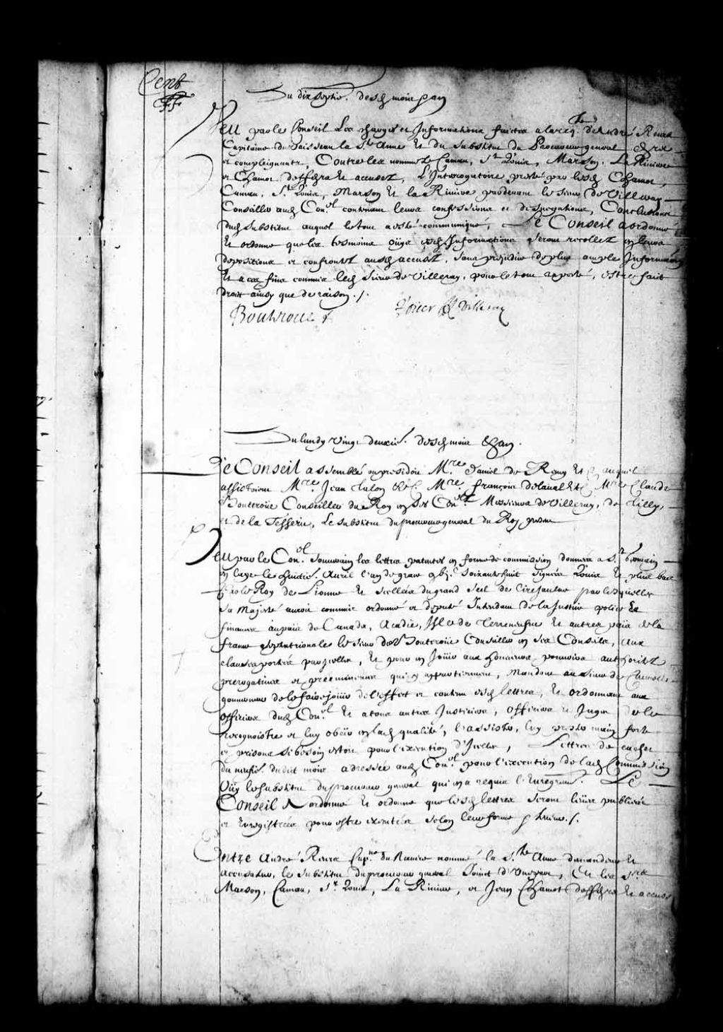 Transcription du texte avec orthographe modernisée : «Du lundi vingt-deuxième desdits mois et an. Le Conseil assemblé où présidait messire Daniel de Rémy etc auquel assistaient messire Jean Talon etc. messire François de Laval etc., messire Claude Bouteroue conseiller du Roi en ses Conseils Messieurs de Villeray, de Tilly, et de la Tesserie, le substitut du procureur général du Roi présent. Vu par le Conseil souverain les lettres patentes en forme de commission données à Saint-Germain en Laie le huitième avril l'an de grâce mille six cent soixante-huit signées Louis et plus bas par le Roi de LIONNE et scellées du grand sceau de cire jaune par lesquelles sa Majesté aurait commis ordonné et député intendant de la justice police et finances au pays de Canada, Acadie, île de Terre-Neuve et autres pays de la France septentrionale le sieur de Bouteroue conseiller en ses Conseils, aux clauses portées par icelles, et pour en jouir aux honneurs pouvoirs autorités prérogatives et prééminences qui y appartiennent, mandant au sieur de Courcelle gouverneur de le faire jouir de l'effet et contenu lesdites lettres, et ordonnant aux officiers dudit Conseil et à tous autres justiciers, officiers et juges de le reconnaître et lui obéir en ladite qualité, l'assister, lui prêter main-forte et prisons si besoin était pour l'exécution d'icelles, lettres de cachet du neuvième dudit mois adressée audit Conseil pour l'exécution de ladite commission ouï le substitut du procureur général qui en a requis l'enregistrement, le Conseil a ordonné et ordonne que lesdites lettres seront lues publiées et enregistrées pour être exécutées selon leur forme et teneur.»