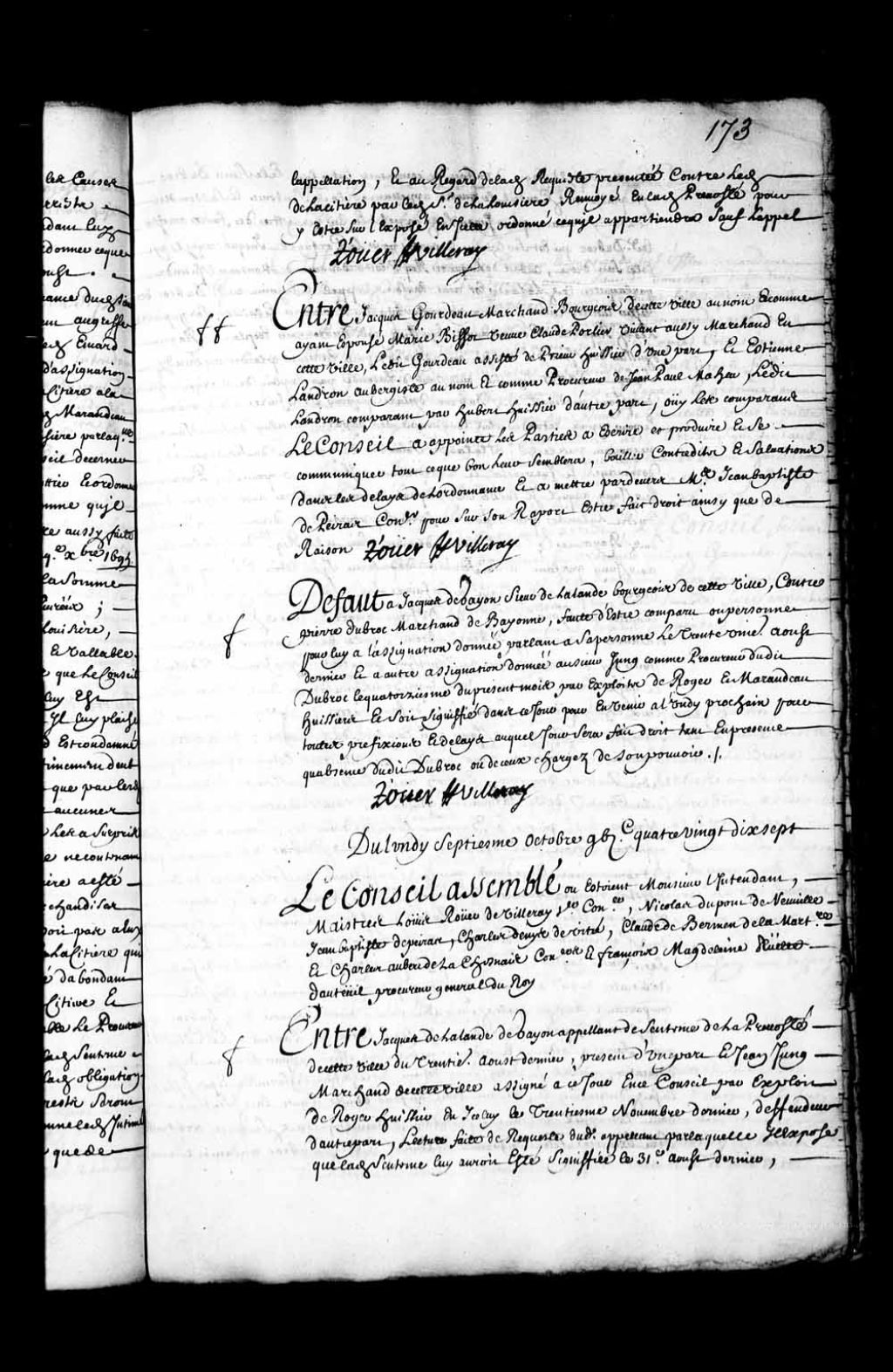 Transcription du texte avec orthographe modernisée : «Défaut à Jacques de Gayon sieur de Lalande bourgeois de cette ville, contre Pierre Dubroc marchand de Bayonne, faute d'être comparu ou personne pour lui à l'assignation donnée parlant à sa personne le trente et unième. août dernier et à autre assignation donnée au sieur Jung comme procureur dudit Dubroc le quatorzième du présent mois par exploits de Roger et Maranda huissiers et soit signifié dans ce jour pour en venir à lundi prochain pour toutes préfixions et délais auquel jour sera fait droit tant en présence qu'absence dudit Dubroc ou de ceux chargés de son pouvoir. ROUER DE VILLERAY.»