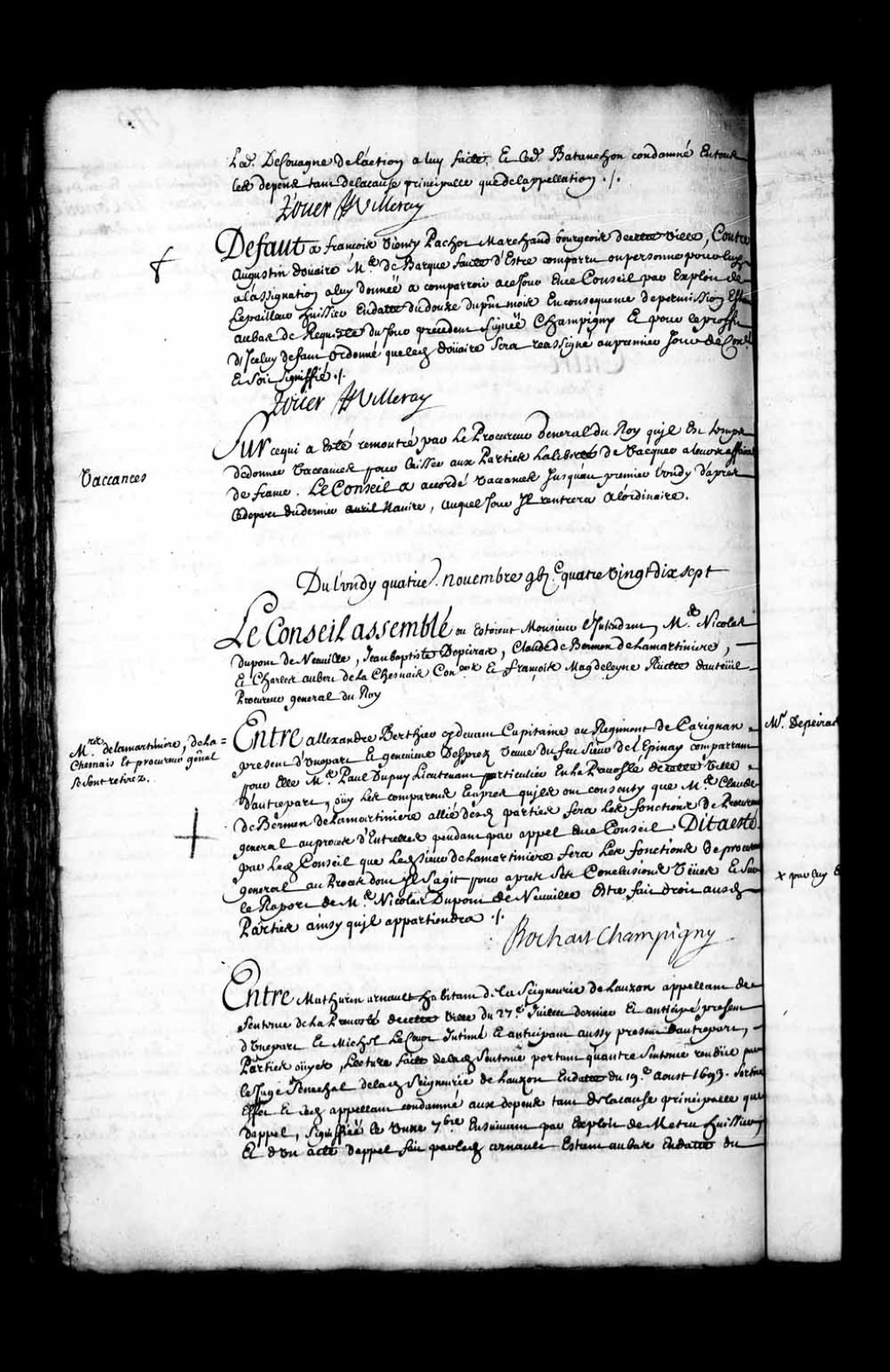 Transcription du texte avec orthographe modernisée : «Défaut à François Vienney Pachot marchand bourgeois de cette ville, contre Augustin Douaire maître de barque faute d'être comparu ou personne pour lui à l'assignation à lui donnée à comparoir à ce jour en ce Conseil par exploit de Lepailleur huissier en date du douze du présent mois en conséquence de permission étant au bas de requête du jour précédent signée Champigny et pour le profit d'icelui défaut ordonné que ledit douaire sera réassigné au premier jour de Conseil. Et soit signifié. ROUER DE VILLERAY.»