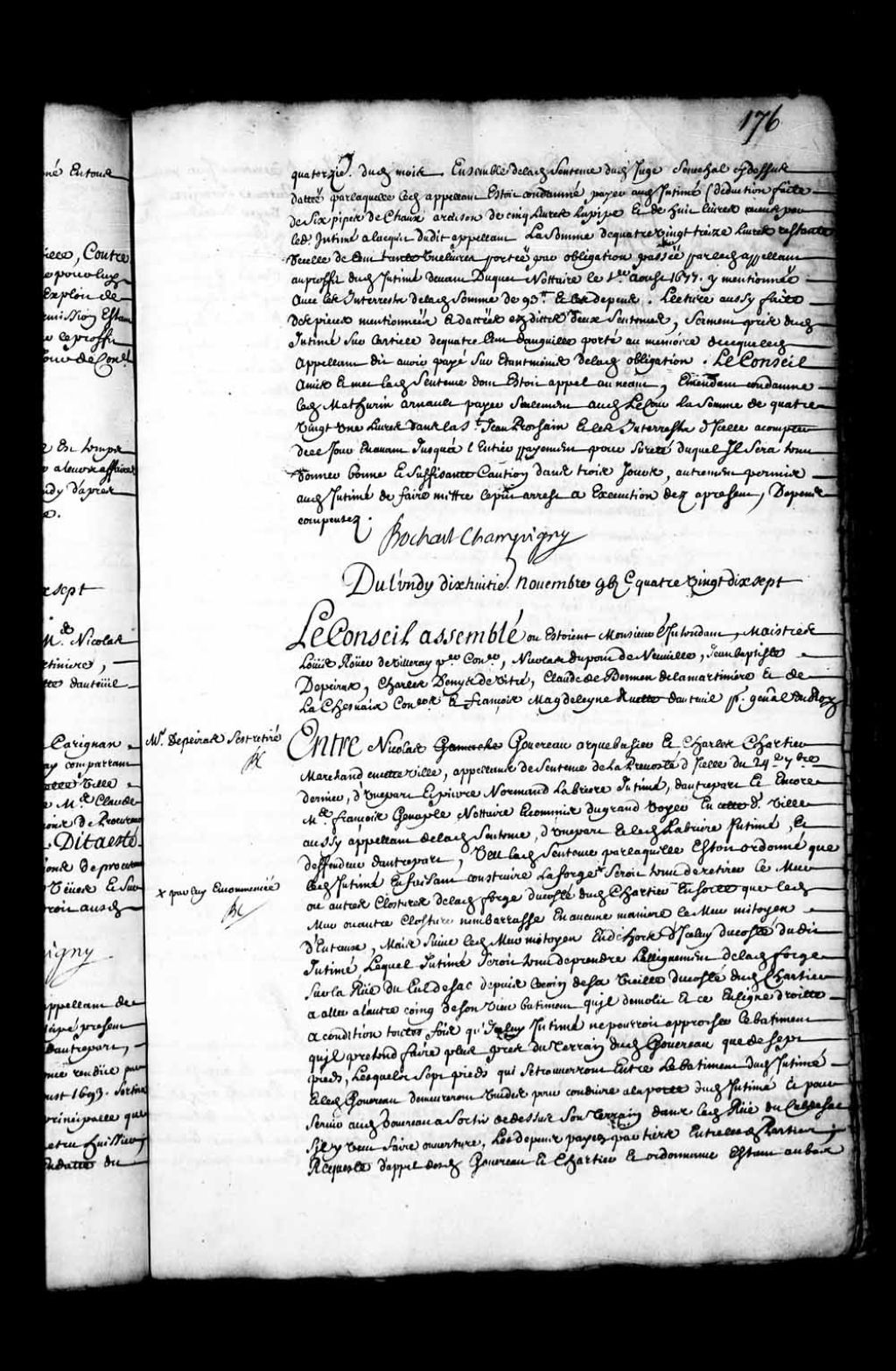 Transcription du texte avec orthographe modernisée : «Du lundi dix-huitième novembre mille six cent quatre-vingt-dix-sept. Le Conseil et assemblé où étaient Monsieur l'intendant, maîtres Louis Rouer de Villeray, premier conseiller, Nicolas Dupont de Neuville, Jean-Baptiste Depeiras, Charles Denys de Vitré, Claude de Bermen de La Martinière et de Lachesnais conseillers et François Madeleine Ruette d'Auteuil procureur général du Roi. Monsieur Depeiras s'est retiré. BOCHART CHAMPIGNY. Entre Nicolas GOVEREAU (Gauvrreau, Gauvereau) arquebusier et Charles CHARTIER marchand en cette ville appelant de sentence de la prévôté d'icelle du 24e septembre dernier, d'une part et Pierre NORMAND LABRIERE intimé, d'autre part et encore maître François GENAPLE notaire et commis du grand voyer en cette dite ville aussi appelant de ladite sentence, d'une part et ledit LABRIERE intimé, et défendeur d'autre part, vu ladite sentence par laquelle était ordonné [...]