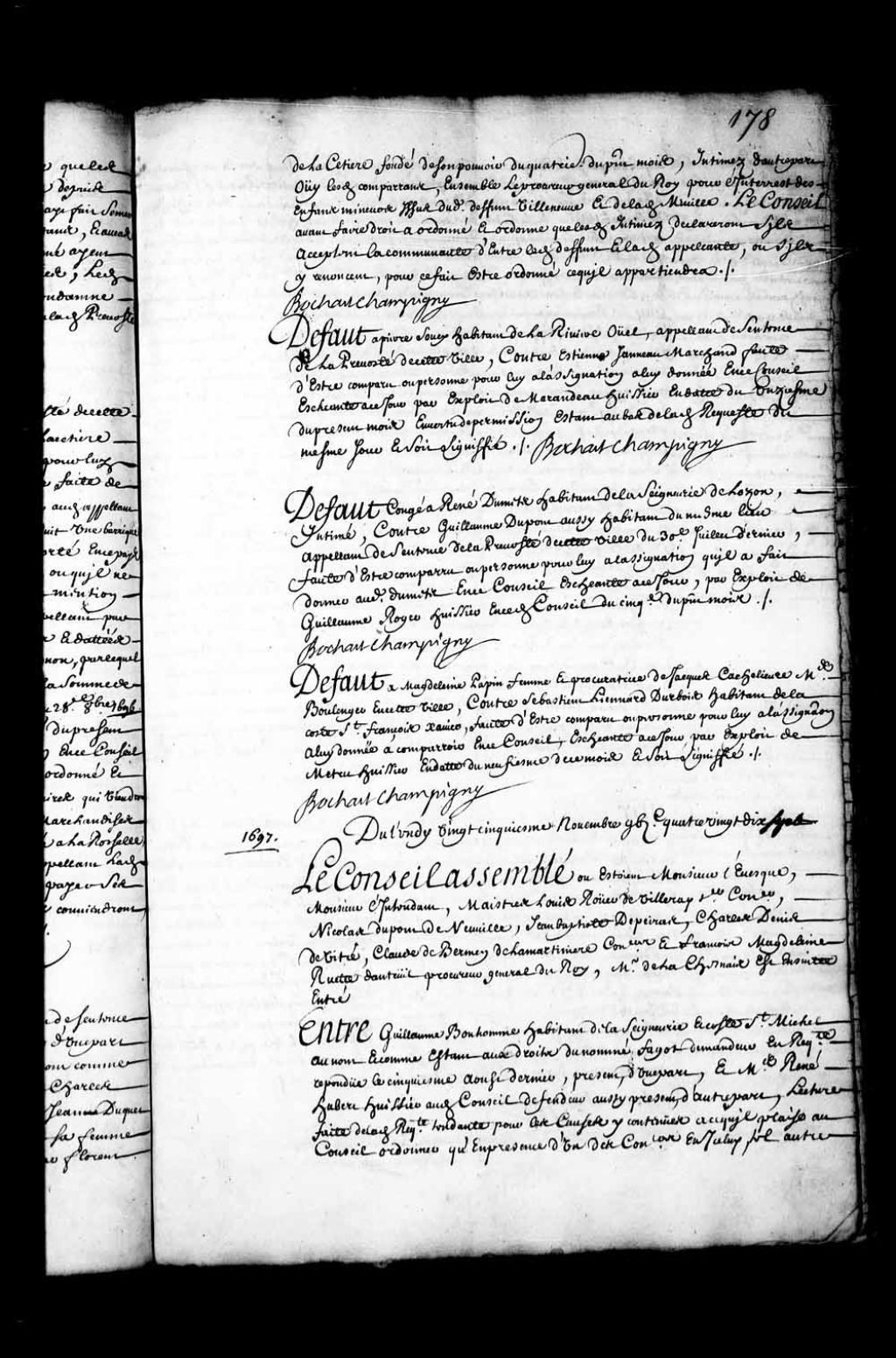 Transcription du texte avec orthographe modernisée : «Défaut à Pierre Soucy habitant de la Rivière Ouel, appelant de sentence de la prévôté de cette ville, contre Etienne Janneau marchand faute d'être comparu ou personne pour lui à l'assignation à lui donnée en ce Conseil échéante à ce jour par exploit de Marandeau huissier en date du onzième du présent mois en vertu de permission étant au bas de ladite requête du même jour et soit signifié. BOCHART CHAMPIGNY.»