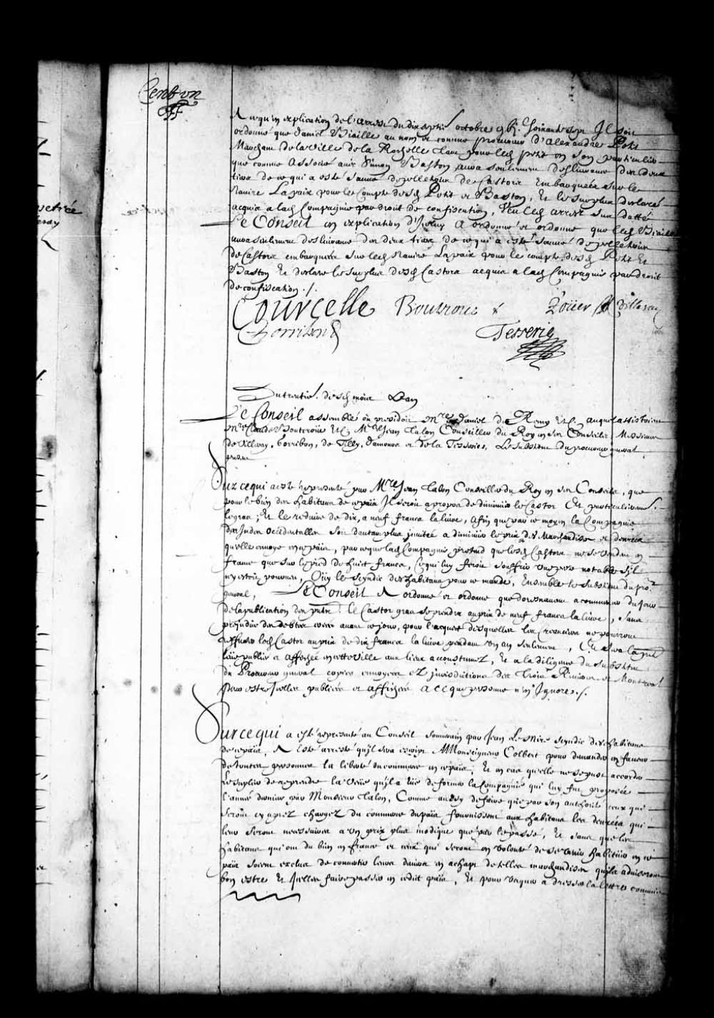 - Transcription du texte avec orthographe modernisée : «Du trentième desdits mois et ans. Le Conseil assemblé où présidait messire Daniel de Rémy etc. auquel assistaient messire Claude Bouteroue etc. messire Jean Talon conseiller du Roi en ses Conseils, Messieurs de Villeray, Gorribon, de Tilly, Damours et de la Tesserie, le substitut du procureur général présent. Sur ce qui a été représenté par messire Jean Talon conseiller du Roi en ses Conseils que pour le bien des habitants de ce pays il serait à propos de diminuer le castor et particulièrement le gras, et le réduire de dix à neuf francs la livre, afin que par ce moyen la compagnie des Indes Occidentales soit d'autant plus invitée a diminuer le prix des marchandises et denrées qu'elle envoie en ce pays, par ce que ladite compagnie prétend que lesdits castors ne se vendent en France que sur le pied de huit francs, ce qui lui ferait souffrir une perte notable s'il n'y était pourvu, ouï [...]