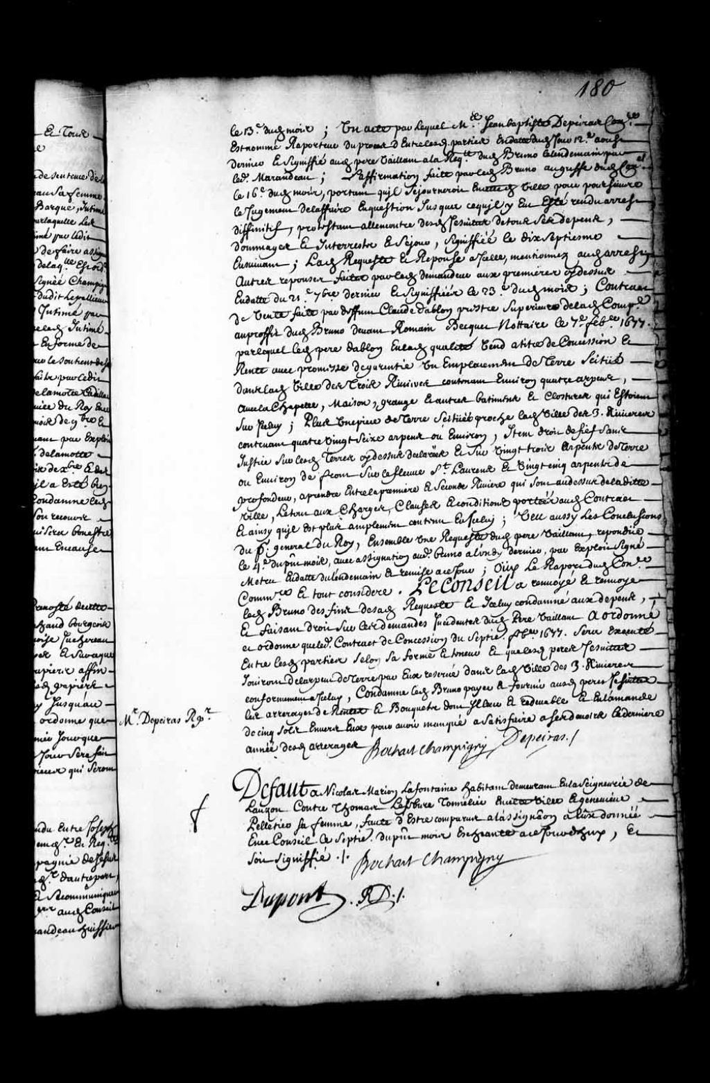 Transcription du texte avec orthographe modernisée : «Défaut à Nicolas Marion Lafontaine habitant demeurant en la seigneurie de Lauson contre Thomas Lefebvre tonnelier en cette ville et Geneviève Pelletier sa femme, faute d'être comparus à l'assignation à eux donnée en ce Conseil le septième du présent mois échéante à ce jourd'hui, et soit signifié. BOCHART CHAMPIGNYDUPONT R. D»