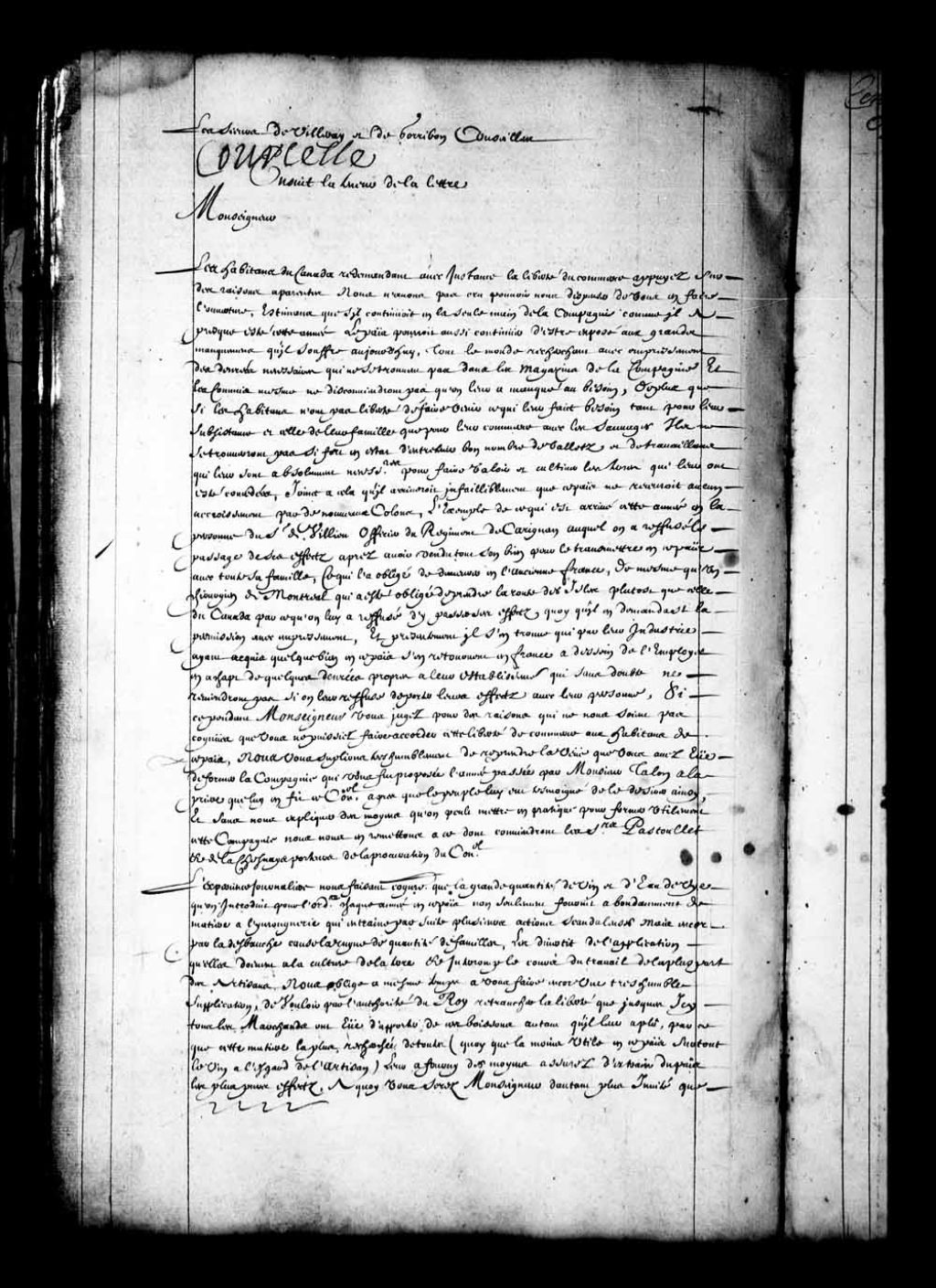 - Transcription du texte avec orthographe modernisée : «Ensuit la teneur de la lettre, Monseigneur, Les habitants du Canada redemandant avec instance la liberté du commerce appuyés sur des raisons apparentes nous n'avons pas cru pouvoir nous dispenser de vous en faire l'ouverture, estimant que s'il continuait en la seule main de la compagnie comme il a presque été cette année le pays pourrait aussi continuer d'être exposé aux grands manquements qu'il souffre aujourd'hui, tout le monde recherchant avec empressement des denrées nécessaires qui ne se trouvent pas dans les magasins de la compagnie et les commis même ne disconviendront pas qu'on leur a manqué au besoin, de plus que si les habitants n'ont pas liberté de faire venir ce qui leur fait besoin tant pour leur subsistance et celle de leur famille que pour leur commerce avec les Sauvages ils ne se trouveront pas si fort en état d'entretenir bon nombre de valets et de travaillant qui [...]
