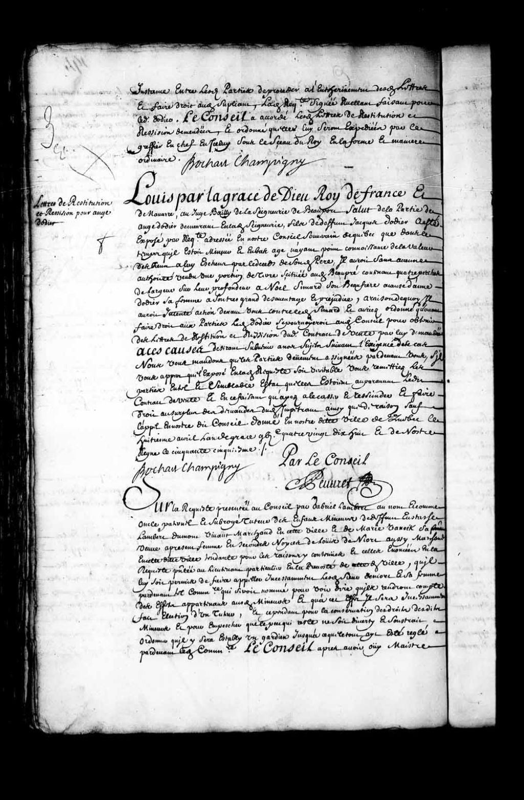 - Transcription du texte avec orthographe modernisée : «Sur la requête présentée au Conseil par Gabriel Lambert au nom et comme oncle paternel et subrogé tuteur des enfants mineurs de défunt Eustache Lambert Dumont vivant marchand en cette ville et de Marie Vaneck sa veuve à présent femme en secondes Noces de Louis de Niort aussi marchand en cette dite ville, tendante pour les raisons y contenues et celles énoncées en la requête présentée au lieutenant particulier en la prévôté de cette dite ville, qu'il lui soit permis de faire appeler incessamment lesdits sieur de niort et sa femme par-devant tel commissaire qui serait nommé pour voir dire qu'ils rendront compte des effets appartenant auxdits mineurs et qu'à cet effet il sera incessamment fait élection d'un tuteur, et cependant pour la conservation des droits desdits mineurs et pour empêcher que le peu qui reste ne soit diverti et soustrait, ordonne qu'il y sera établi un gardien jusqu'à ce que le tout ait été réglé par-devant ledit commissaire, le Conseil après avoir ouï maître Charles Aubert de Lachesnais conseiller faisant en cette partie fonction de procureur général du Roi pour l'intérêt desdits mineurs attendu l'absence d'icelui. a permis audit subrogé tuteur faire saisir les meubles et effets appartenant auxdits mineurs pour sûreté d'iceux et empêcher ledit de niort de les divertir ou dissiper. Et a commis et commet maître Guillaume Royer juge prévôt de Notre-Dame-des-Anges pour juger et terminer le différent d'entre lesdites parties sauf l'appel. BOCHART CHAMPIGNY.»
