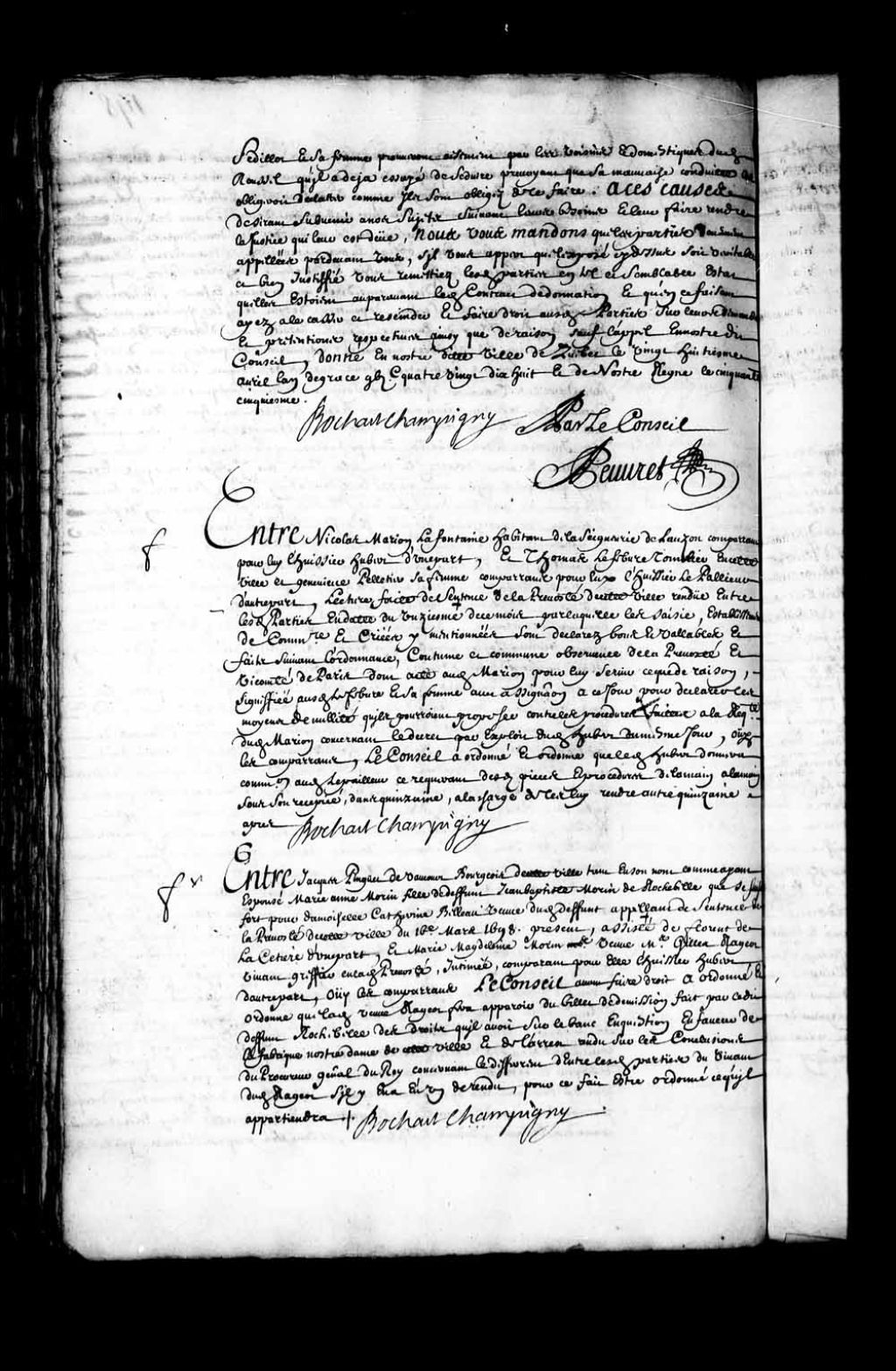 Transcription du texte avec orthographe modernisée : «Entre Jacques PINGUET DE VAUCOURT Bourgeois de cette ville tant en son nom comme ayant épousé Marie Anne Morin fille de défunt Jean-Baptiste Morin de Rochebelle que se faisant fort pour demoiselle Catherine Belleau veuve dudit défunt appelant de sentence de la prévôté de cette ville du 16e mars 1698 présent, assisté de Florent de LaCetière d'une part, et Marie Madeleine MORIN veuve maître Gilles Rageot vivant greffier en ladite prévôté, intimée, comparant pour elle l'huissier Hubert d'autre part, ouï les comparant, le Conseil avant faire droit a ordonné et ordonne que ladite veuve Rageot fera apparaître du billet de démission fait par ledit défunt Rochebelle des droits qu'il avait sur le banc en question en faveur de la fabrique Notre-Dame de cette ville et de l'arrêt rendu sur les conclusions du procureur général du Roi concernant le différent d'entre lesdites parties du vivant dudit Rageot s'il y en a eu un de rendu, pour ce fait être ordonné ce qu'il appartiendra. BOCHART CHAMPIGNY.»