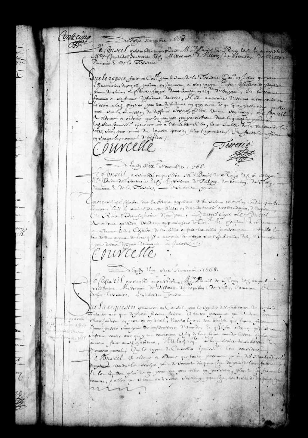 - Transcription du texte avec orthographe modernisée : «Du lundi vingt-sixième novembre 1668. Le Conseil assemblé où présidait messire Daniel de Rémy etc, auquel assistaient Messieurs de Villeray, de Gorribon, de Tilly, Damours et de la Tesserie, le substitut présent. L'ordonnance ci à côté a été publiée et affichée par l'huissier LeVasseur, le neuvième décembre 1668. Sur la requête présentée au Conseil par le syndic des habitants de ce pays, tendante à ce que défenses fussent faites à toutes personnes qui vendent des marchandises en gros ou en détail, d'excéder le prix des tarifs qui furent faits l'année passée sous peine de confiscation et d'amende, et qu'il fût ordonné qu'il serait informé contre ceux qui ont contrevenu afin de leur faire amender le tort qu'ils auraient fait auxdits habitants; vu ladite requête, réquisitoire du substitut du procureur général; ouï le rapport du conseiller commissaire tout considéré, le Conseil a ordonné [...]
