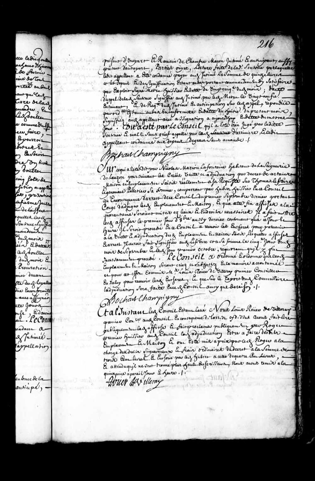 Transcription du texte avec orthographe modernisée : «Et à l'instant, ledit Conseil étant levé, nous Louis Rouer de Villeray premier conseiller audit Conseil en conséquence de l'arrêt ci-dessus avons faits lire publiquement ladite affiche et fait proclamer publiquement par Roger premier huissier audit Conseil ladite adjudication être à faire desdits emplacement et maison et ont été mis à prix par ledit Rouer à la charge des droits seigneuriaux et frais ordinaires du décret à la somme de trois cents livres et enchérie par ledit Hubert à celle de quatre cents livres, et attendu qu'il ne s'est trouvé plus haut enchérisseur. nous avons remis à la quinzaine à pareil jour et heure. ROUER DE VILLERAY.»