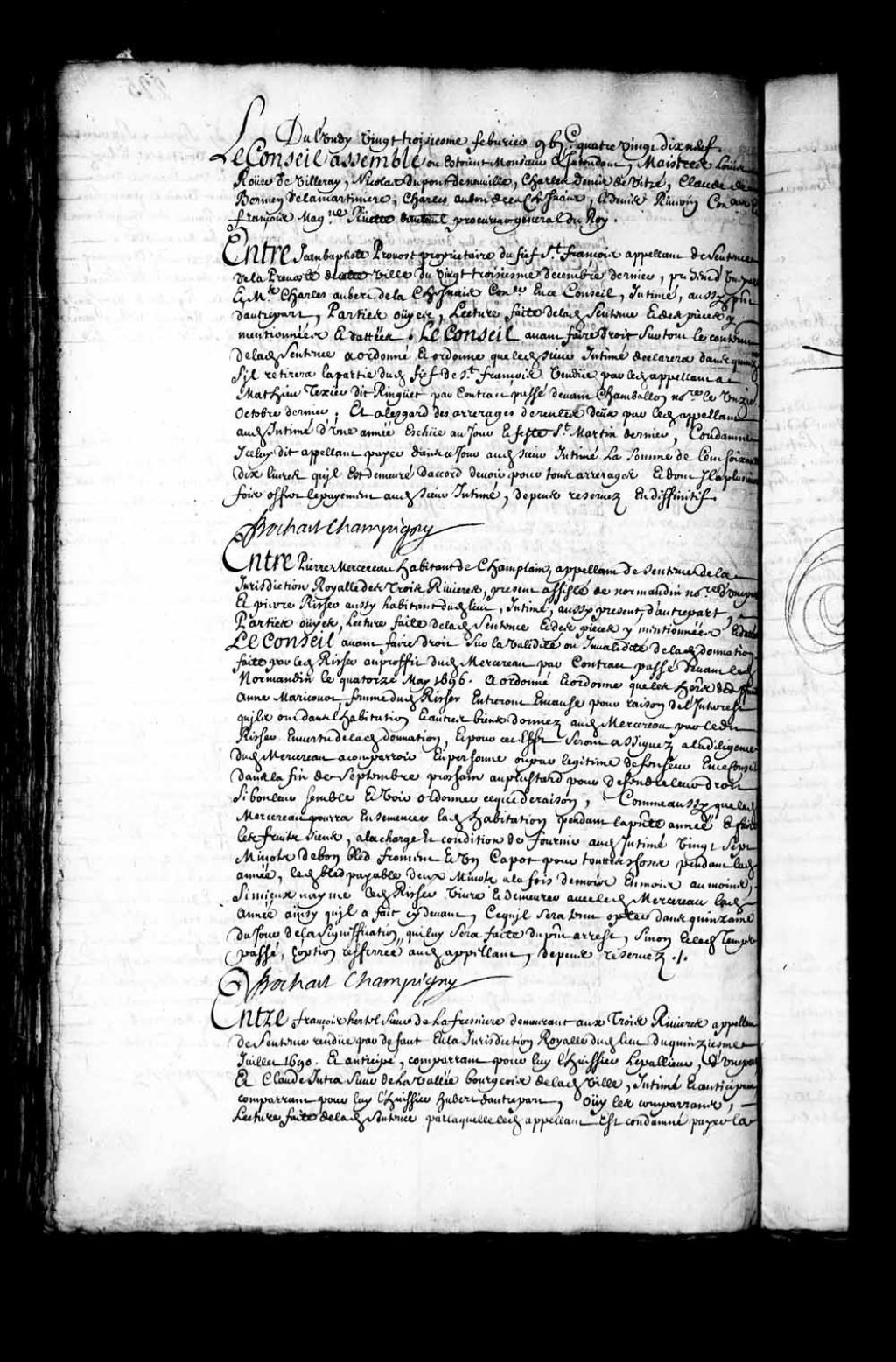 - Transcription du texte avec orthographe modernisée : «Du lundi vingt-troisième février mille six cent quatre-vingt-dix-neuf. Le Conseil assemblé où étaient Monsieur l'intendant, maître Louis Rouer de Villeray, Nicolas Dupont de Neuville, Charles Denys de Vitré, Claude de Bermen de La Martinière, Charles Aubert de Lachesnais, et Denis Riverin conseiller et François Madeleine Ruette d'Auteuil procureur général du Roi. Entre Jean-Baptiste PROVOST propriétaire du fief Saint-François appelant de sentence de la prévôté de cette ville du vingt-troisième décembre dernier, présent d'une part et maître Charles Aubert de LACHESNAIS conseiller en ce Conseil, intimé, aussi présent d'autre part. Parties ouïes, lecture faite de ladite sentence et des pièces y mentionnées et datées. Le Conseil avant faire droit sur tout le contenu de ladite sentence a ordonné et ordonne que ledit sieur intimé déclarera dans quinzaine s'il retirera la partie dudit fief de Saint-François vendue par ledit appelant à Mathieu Texier dit Ringuet par contrat passé devant Chamballon notaire le onzième octobre dernier; et à l'égard des arrérages de rentes deux par ledit appelant audit intimé d'une année échue au jour et fête Saint-Martin dernier, condamne icelui dit appelant payer dans ce jour audit sieur intimé la somme de cent soixante-dix livres qu'il est demeuré d'accord devoir pour tous arrérages et dont il a plusieurs fois offert le payement audit sieur intimé, dépens réservés en définitif BOCHART CHAMPIGNY.»