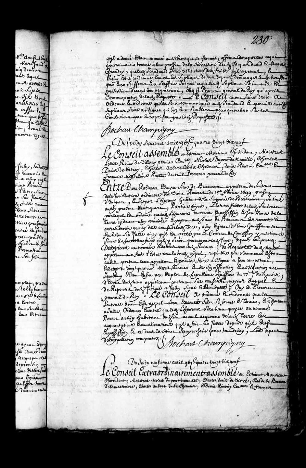 - Transcription du texte avec orthographe modernisée : «Du jeudi neuvième avril mille six cent quatre-vingt-dix-neuf. Le Conseil extraordinairement assemblé où étaient Monsieur l'intendant, maître Nicolas Dupont de Neuville, Charles Denys de Vitré, Claude de Bermen de La Martinière, Charles Aubert de Lachesnais, et Denis Riverin conseillers et François Madeleine Ruette d'Auteuil procureur général du Roi. Vu au Conseil la requête présentée en icelui par Gabriel Lambert au nom et comme oncle Paternel et subrogé tuteur des enfants mineurs de défunt Eustache Lambert Dumont son frère et de Marie Vanech (Vanneck) mère et tutrice desdits mineurs, ladite requête signée Prieur pour ledit Lambert, par laquelle il expose entre autres choses qu'il a appris depuis quelques jours, que Louis Deniort (De Niort) qui a épousé en secondes noces ladite Vaneck et elle vivant dans une entière mésintelligence et désunion consommaient la meilleure partie des [...]