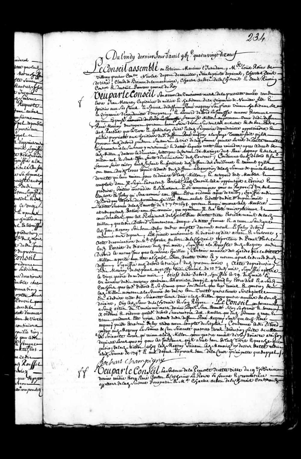 Transcription du texte avec orthographe modernisée : «Vu par le Conseil la sentence de la prévôté de cette ville du 19e février dernier rendue entre René Goullet (Goulet) et Catherine LeRoux sa femme et procuratrice appelant de la sentence d'une part et maître Charles Aubert de Lachesnais conseiller audit Conseil intimé, d'autre part, par laquelle lesdits appelants étaient condamnés payer audit sieur intimé la somme de quatre mille trois cent dix livres dix-sept sols dix deniers déduction faite des quatre articles y spécifiés montant à deux cent quatre-vingt-douze livres. De celle de quatre mille six cent deux livres dix-sept sols dix deniers qui était ce que lesdits appelants se trouvaient devoir audit intimé si ladite déduction n'était faite, sauf à eux à se faire payer par les habitants de Lachesnais de la somme de onze cent soixante-quatre livres et de faire preuve qu'il y a eu deux billets du sieur de LaTouche commissaire de la marine payés audit sieur intimé en 1694 et en 1695, et encore à faire preuve qu'ils ont construit des bâtiments sur la ferme dudit sieur intimé pendant leur bail, lesquelles preuves seront faites dans le mois après la signification de ladite sentence, et ledit temps passé elle serait exécutée pour ladite somme de quatre mille trois cent dix livres dix-sept sols dix deniers et au surplus des demandes respectives des parties icelles renvoyées hors de Cour et lesdits appelants condamnés aux dépens signifiée auxdits appelants par exploit étant au bas en date du 13e mars ensuivant, signé Prieur portant commandement d'y satisfaire, l'acte d'appel de ladite sentence interjeté par ladite Catherine LeRoux étant ensuite du même jour; requête de ladite LeRoux tendante à être reçue en sondit appel, répondue par ordonnance étant au bas en conformité de la demande du lendemain signifiés audit sieur intimé avec assignation du lundi suivant en huitaine par exploit de Guillaume Roger huissier audit Conseil en date du même jour; avenir signifié à la requête de ladite appelante audit sieur intimé audit conseil le lundi d'après le 26e dudit mois de mars date d'icelui, signé Roger; arrêt d'appointement entre lesdites parties à écrire, produire et se communiquer en date du deuxième du présent mois d'avril signifié à la requête de ladite LeRoux audit sieur intimé le même jour; acte par lequel maître Denis Riverin conseiller est nommé rapporteur au procès d'entre lesdites parties et la signification d'icelle étant au bas dudit jour; griefs d'appel desdits Goullet et sa femme aussi signifiés le deuxième du présent mois; requête de ladite LeRoux adressée audit conseiller commissaire aux fins de faire produire ledit sieur de Lachesnais, son ordonnance étant au bas du onzième dudit présent mois et la signification du tout du même jour; acte de production faite par lesdits appelants au greffe dudit Conseil du quinzième ensuivant et la signification d'icelui du même jour; réponses dudit sieur de Lachesnais auxdits griefs signifiés le vingt-quatrième; acte de production dudit sieur intimé audit greffe et signification d'icelui du lendemain; et une requête de ladite appelante contenant quelques répliques audit réponses aussi du même jour, ouï le rapport dudit conseiller commissaire et tout considéré. Le Conseil sans avoir égard à ladite sentence dont est appel a ordonné et ordonne que sur les sommes de douze cents livres de diminution prétendue par lesdits appelants, de huit cents livres pour un billet de change qu'ils disent avoir envoyé en payement audit sieur intimé au mois de mai 1695 ce qu'ils n'ont pu justifier, et pour trois cent pieux fournis par ledit Goullet pour le fort de Lachesnais dont il prétendait cent cinquante livres et pour lesquels il ne lui a été adjugé par ladite sentence que cents livres, il sera seulement tenu compte auxdits appelants par ledit sieur intimé de la somme de neuf cents livres pour toutes choses, comme aussi a déchargé et décharge lesdits appelants des bois de charpente et billes de Pin mentionnés au bail passé entre lesdites parties qui sont demeurés sur ladite ferme en tout ou partie lesquelles appartiendront audit sieur de Lachesnais pour en disposer ainsi qu'il avisera bon être ; qu'à l'égard des rentes offertes par lesdits appelants audit sieur intimé en payement pour ladite somme de onze cent soixante-quatre livres ledit Goullet aura un an pour en faire le recouvrement des débiteurs d'icelles et pour en faire le payement audit sieur de Lachesnais du jour de la signification du présent arrêt, si mieux n'aime ledit sieur de Lachesnais les recevoir dès à présent pour son compte et en déduction de ce que ledit Goullet se trouvera lui devoir; et que pour ce qui est de l'erreur de quatre cent dix-huit livres seize sols prétendue être par lesdits appelants dans les comptes que ledit sieur de Lachesnais leur a fourni, ordonne ledit Conseil avant faire droit sur ce chef que les livres dudit sieur intimé seront apportés audit Conseil lundi prochain, les dépens tant de la cause principale que d'appel compensés. BOCHART CHAMPIGNY.»
