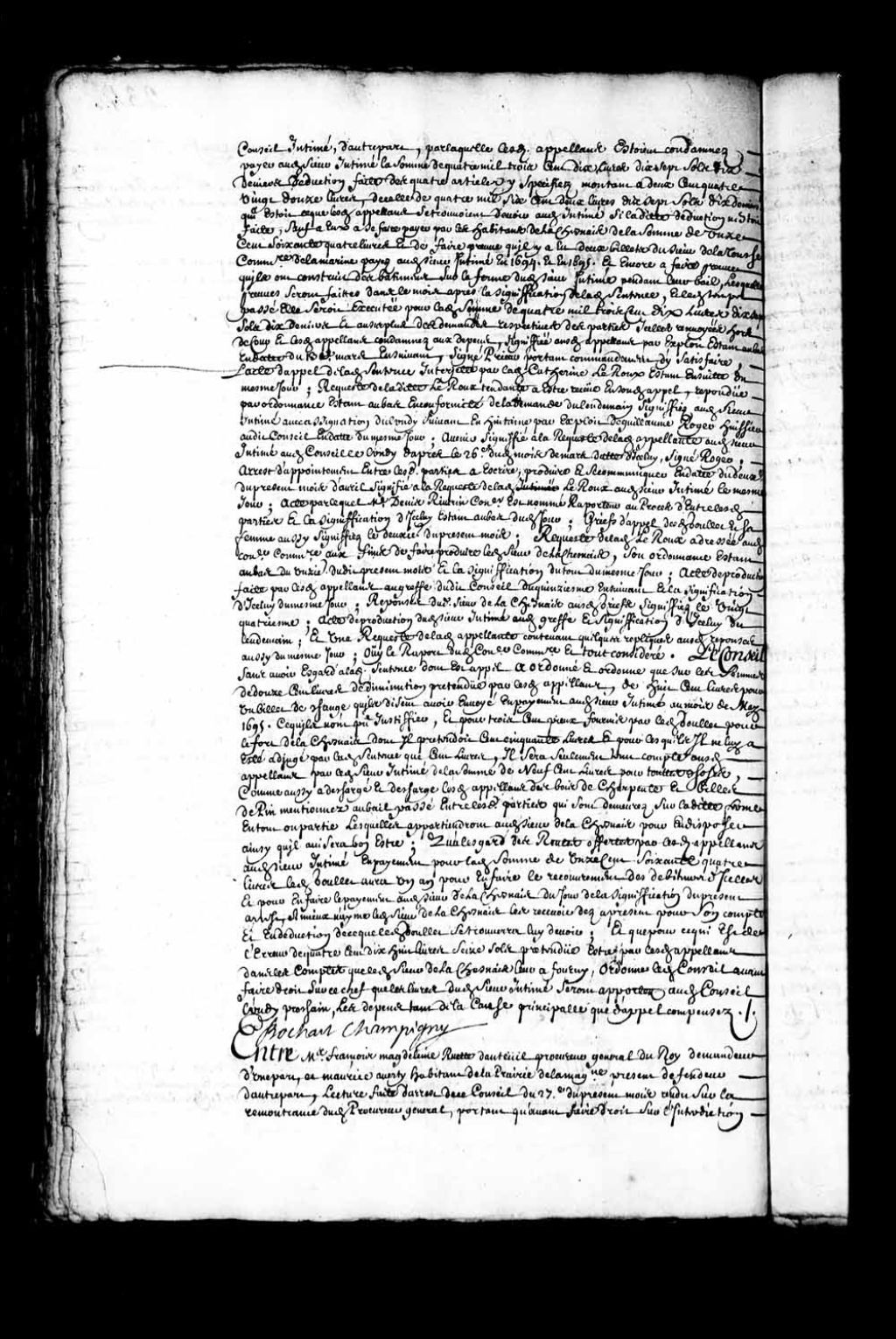 - Transcription du texte avec orthographe modernisée : «Entre maître François Madeleine RUETTE D'AUTEUIL procureur général du Roi demandeur d'une part et Maurice Averti habitant de la Prairie de la Madeleine présent défendeur d'autre part; lecture faite d'arrêt de ce Conseil du 27e du présent mois rendu sur la remontrance dudit procureur général, portant qu'avant faire droit sur l'interdiction dudit Averti de la conduite et disposition de ses biens faute de capacité, qu'il serait informé à cet effet; d'acte étant au bas par lequel maître Nicolas Dupont de Neuville conseiller est commis pour l'exécution dudit arrêt du même jour; d'exploits d'assignations données à Jean Soullard arquebusier en cette ville, à Pierre Collas soldat et Frater de la compagnie de Vaudreuil et à Florent de LaCetière tapissier en cette dite ville pour déposer de la connaissance qu'ils pouvaient avoir du contenu en ladite remontrance et audit Averti pour répondre aux prétentions dudit procureur général en date du jourd'hier; et d'enquête faite par ledit conseiller commissaire contenant l'audition desdits Soullard, de LaCetière et Collas de ce jourd'hui. Le Conseil après avoir ouï ledit procureur général et ledit Averti, a déclaré et déclare icelui Averti incapable de la conduite et administration de ses biens tant meubles qu'immeubles, ce faisant l'en a interdit et ordonné qu'il lui sera nommé un curateur à la conservation d'iceux par maître Juchereau juge royal de Montréal assemblée de parents ou amis dudit Averti préalablement faite et icelui averti condamné aux dépens. BOCHART CHAMPIGNY.»