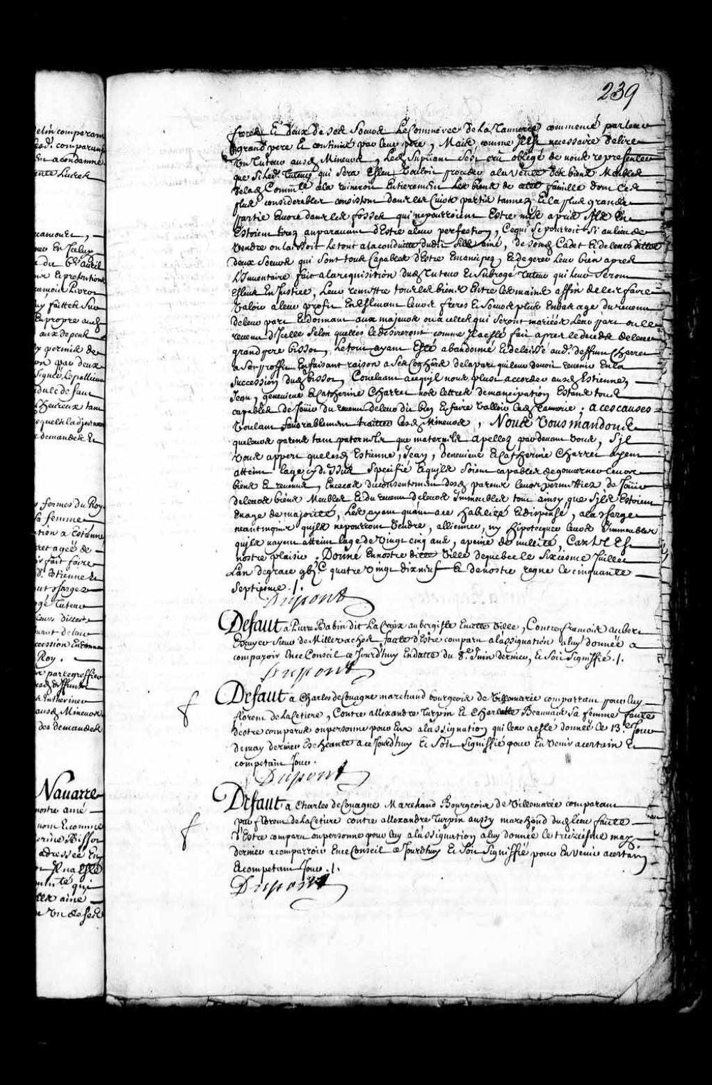Défaut accordé à Charles de Couagne, marchand bourgeois de Ville-Marie contre Alexandre Turpin et Charlotte Beauvais, sa femme, 6 juillet 1699, Archives nationales à Québec, Fonds Conseil souverain, (03Q,TP1,S28,P6301).