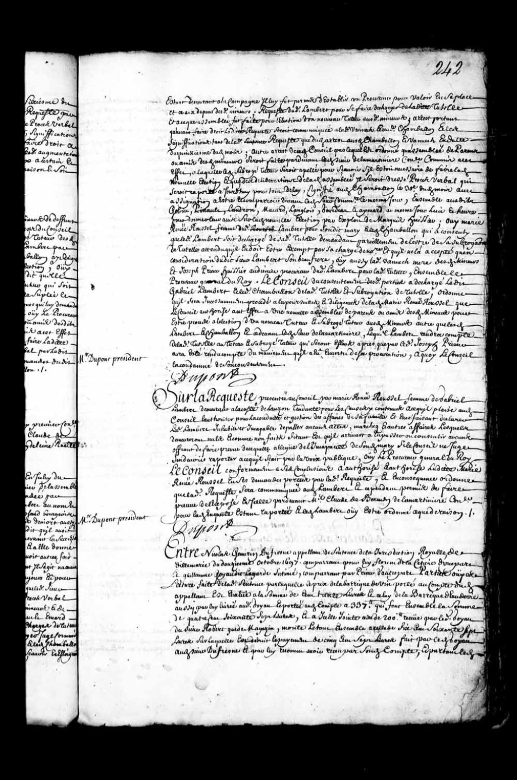 - Transcription du texte avec orthographe modernisée : «Monsieur Dupont président. Sur la requête présentée au Conseil par Marie Renée Roussel femme de Gabriel Lambert, demeurant à la côte de Lauson (Lauzon) tendante pour les causes y contenues à ce qu'il plaise audit Conseil l'autoriser pour la conduite et gestion des affaires de sa famille et en ce faisant déclarer ledit Lambert inhabile et incapable de passer aucuns actes, marchés et autres affaires lesquels demeureront nuls et comme non faits si tant est qu'il arriva a en passer ou consentir aucuns offrant de faire preuve de ce qu'elle allègue de l'incapacité de sondit mari si le Conseil ne juge s'en devoir rapporter à ce qu'il sait par la voix publique, ouï le procureur général du Roi. Le Conseil conformément à ses conclusions a autorisé et autorise ladite Marie Renée Roussel en ses demandes portées par ladite requête, et en conséquence ordonne que ladite requête sera communiquée audit Lambert et cependant permis de faire preuve de l'exposé en icelle par-devant maître Claude de Bermen de la Martinière conseiller pour ladite enquête étant rapportée et ledit Lambert ouï être ordonné ce que de raison. DUPONT.»