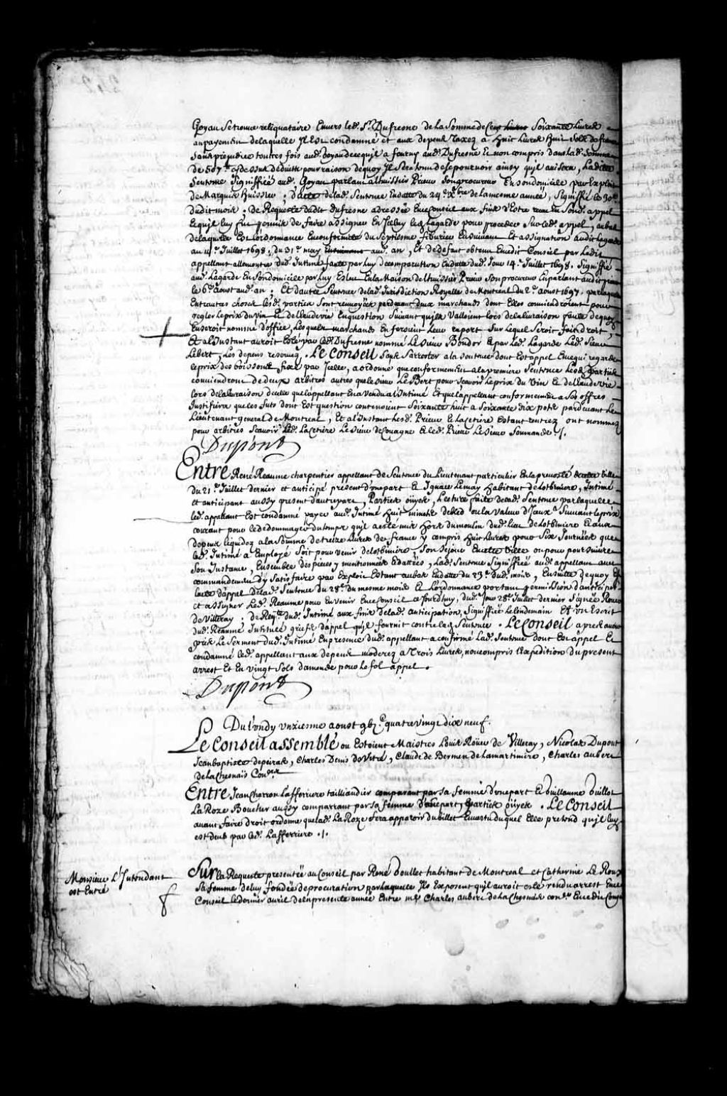 - Transcription du texte avec orthographe modernisée : «Monsieur l'intendant est entré. Sur la requête présentée au Conseil par René Goullet (Goulet) habitant de Montréal et Catherine LeRoux sa femme de lui fondée de procuration par laquelle Ils exposent qu'il aurait été rendu arrêt en ce Conseil le dernier avril de la présente année entre maître Charles Aubert de Lachesnais conseiller en ce dit Conseil et eux par lequel il ne leur a pas été alloué un reçu de 800 livres dudit sieur de Lachesnais qui a été produit au procès bien que la sentence rendue entre les parties en la prévôté de cette ville leur eut adjugé en justifiant dans le cours d'un mois après la signification de ladite sentence, ce qui ne s'est pu faire n'étant pas sur les lieux et le terme étant trop court, ce qui a été cause que ledit Conseil ne leur a pas alloué ledit reçu faute d'avoir pu justifier dans un si bref délai, mais comme depuis, Ils ont trouvé par leurs soins la preuve suffisante, Ils sont obligés d'avoir recours audit Conseil pour leur être sur ce pourvu, concluant à ce qu'il plaise audit Conseil les recevoir à faire ladite preuve et justification, et en ce faisant qu'il lui soit permis de faire signifier audit sieur de Lachesnais les preuves du reçu desdites huit cents livres qu'il a donné en 1695 par ce certificat de celui qui a livré le billet dont son reçu fait foi et par un autre certificat de celui qui a reçu le blé qu'il dit avoir été vendu par sa lettre et surseoir l'exécution dudit arrêt attendu que ledit sieur de Lachesnais leur demande neuf cent seize livres plus que ledit arrêt ne porte, ne leur passant pas acompte le bois de charpente, au bas de laquelle requête est une ordonnance portant soit partie appelée pour en venir à ce jour, en date du premier de ce mois, signée Rouer de Villeray et la signification tant de ladite requête, ordonnance que desdits deux certificats du même jour avec assignation à ce jourd'hui: vu ledit arrêt du dernier avril par lequel est ordonné que sans avoir égard à la sentence dont était appel, que sur les sommes de douze cents livres de diminution prétendue par lesdits Goullet et sa femme, de 800 livres pour un billet d'échange qu'ils disent avoir envoyé en payement audit sieur de Lachesnais au mois de mai 1695, ce qu'ils n'ont pu justifier et pour 300 pieux fournis par ledit Goullet pour le fort de Lachesnais dont il prétendait 150 livres et pour lesquels il ne lui a été adjugé par ladite sentence que cents livres, il serait seulement tenu compte auxdits Goullet et sa femme par ledit sieur de Lachesnais de la somme de neuf cents livres pour toutes choses, comme aussi a déchargé et décharge lesdits Goullet et sa femme des bois de charpente et billes de pain mentionnés au bail d'entre lesdites parties qui sont demeurés sur ladite ferme en tout ou partie, lesquels appartiendraient audit sieur de Lachesnais pour en disposer ainsi qu'il aviserait bon être ; qu'à l'égard des rentes offertes en payement par lesdits Goullet et sa femme audit sieur de Lachesnais pour la somme de onze cent soixante-quatre livres, ledit Goullet aurait un an pour en faire le recouvrement des débiteurs d'icelles et pour en faire le payement au audit sieur de Lachesnais du jour de la signification dudit arrêt, si mieux n'aimait ledit sieur de Lachesnais les recevoir des lors pour son compte et en déduction de ce que ledit Goullet se trouverait lui devoir, et que pour ce qui était de l'erreur de 418 livres 16 sols prétendue être dans les comptes que ledit sieur de Lachesnais leur a fait signifier, ordonné avant faire droit sur ce chef que les livres dudit sieur de Lachesnais seraient apportés le lundi suivant, les dépens tant de la cause principale que d'appel, compensés; une lettre écrite par ledit sieur de Lachesnais audit Goullet le dernier mai de ladite année 1695 conçue en ces termes au regard du fait dont est question, j'ai reçu votre billet d'échange qui est bon payement pour huit cents livres du pays, lesdits deux certificats savoir le premier du sieur de Latouche commissaire de la marine portant qu'il a donné à la femme dudit Goullet un billet de six cents livres de France à prendre chez un des trésoriers en exercice en ladite année 1695, pour blé par elle fourni pour le service du Roi en ladite année, en date du 8e juin dernier et le second de Louis LeVasseur garde magasin des vivres pour le Roi à Montréal par lequel il déclare avoir reçu dudit Goullet le premier mai de ladite année 1695. trois cent vingt-six minots de blé à raison de 37 sols 6 deniers le minot qui font la somme de six cents livres de France en date du premier du présent mois; et un acte d'affirmation du voyage de ladite Goullet et protestation de répéter les frais tant dudit voyage que séjour et retour du 27 juillet aussi dernier, signifié à partie ledit jour premier août, ouï lesdites parties et du consentement dudit sieur de Lachesnais qui a dit que par le compte qu'il a tiré conformément audit arrêt lesdits Goullet et sa femme lui doivent treize cent trente livres seulement toutes déductions faites, sur lesquels il consent de leur remettre encore la somme de quatre cents livres des huit cents livres y compris et qui lui sont légitimement deux nonobstant le prétendu payement qu'ils soutiennent avoir fait en ladite année 1695. Et qu'ils croient mal à propos justifier par ladite lettre et certificats plutôt que d'affirmer par serment que ledit billet d'échange ne lui a pas été fourni en ladite année attendu le long temps qui s'est passé depuis et que ce serait plutôt au sieur Gobin qui a tenu ses livres à la faire pouvant mieux s'en ressouvenir, que cependant il est prêt d'affirmer sesdits livres justes, à la charge et condition toutes fois que ledit Goullet et sa femme lui payeront comptant incessamment les neuf cent trente livres qui restent et les intérêts de ladite somme à faute de pro