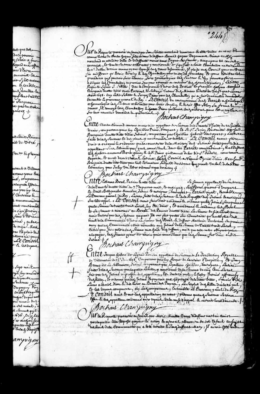 - Transcription du texte avec orthographe modernisée : «Sur la requête présentée au Conseil par Marie Miville veuve de défunt Mathieu Amiot par laquelle elle expose qu'ayant eu action en ce Conseil à l'encontre de ses enfants au sujet des biens de la communauté qui a été entre elle et sondit défunt mari, il aurait été rendu arrêt le 18e novembre dernier portant qu'avant faire droit sesdits enfants déclareront s'ils acceptent la communauté ou s'ils y renoncent, ledit arrêt à eux signifié avec sommation de faire leur déclaration ce que n'ayant fait elle est obligée d'avoir recours audit Conseil à ce qu'il lui plaise attendu qu'ils ne cherchent qu'à prolonger et l'ennuyer, ordonner que pour parvenir à la dissolution de ladite communauté qu'il sera élu un tuteur à ses enfants encore mineurs par-devant un des conseillers dudit Conseil tel qu'il lui plaira de nommer pour ensuite être pris par les parties telle qualité qu'ils aviseront, ladite requête signée Lepallieur; lecture faite dudit arrêt et de la signification d'icelui, et ouï le procureur général du Roi en son réquisitoire, le Conseil a permis et permet à ladite Miville faire procéder en la prévôté de cette ville à l'élection d'un tuteur à sesdits enfants mineurs en la manière accoutumée, après quoi sera fait droit aux Parties ainsi qu'il appartiendra. BOCHART CHAMPIGNY.»