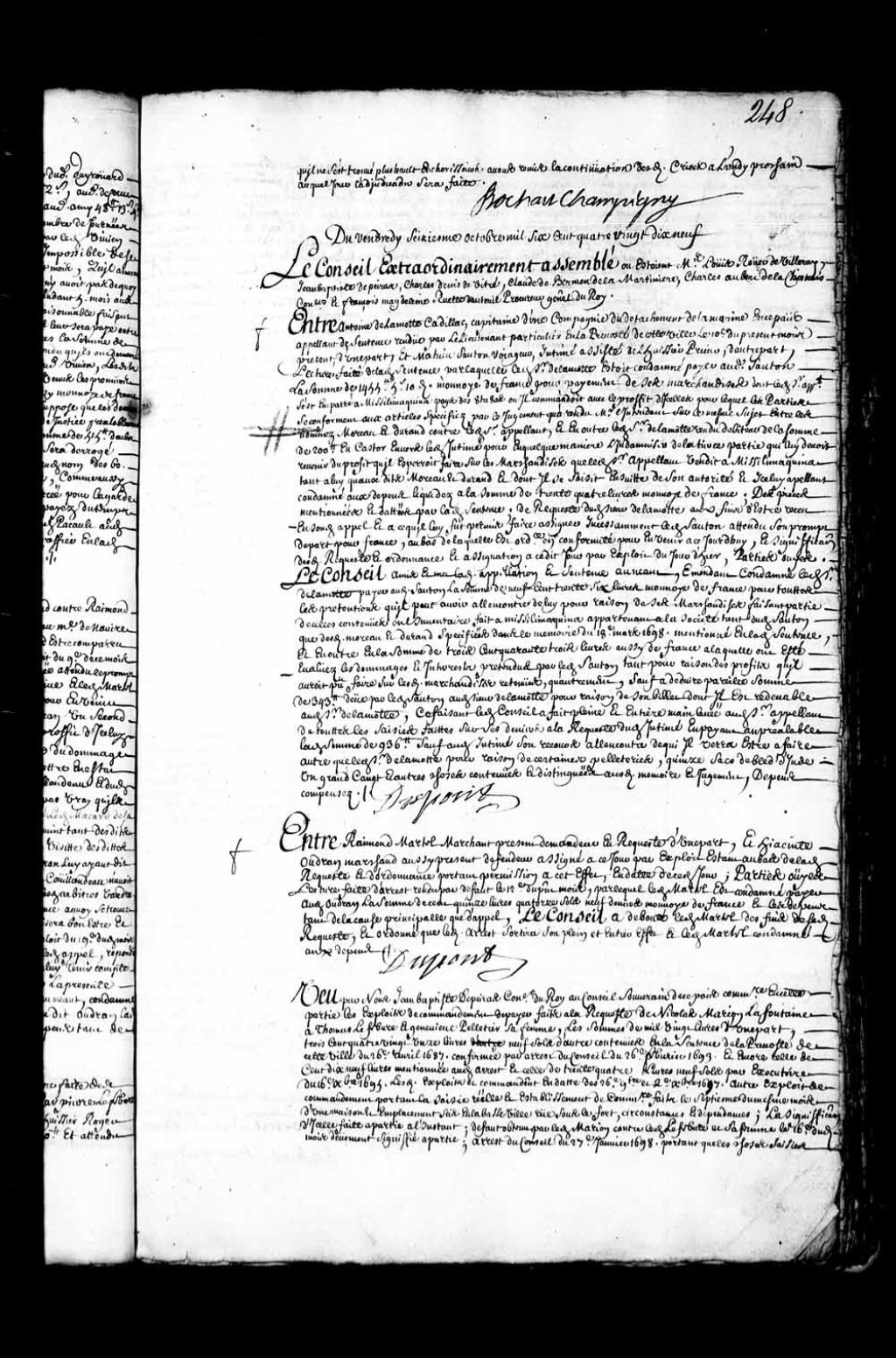 - Transcription du texte avec orthographe modernisée : «Du vendredi seizième octobre mille six cent quatre-vingt-dix-neuf. Le Conseil extraordinairement assemblé où étaient maîtres Louis Rouer de Villeray, Jean-Baptiste Depeiras, Charles Denys de Vitré, Claude de Bermen de la Martinière Charles Aubert de Lachesnais conseillers et François Madeleine Ruette d'Auteuil procureur général du Roi. Entre Antoine de LAMOTTE CADILLAC, capitaine d'une compagnie du détachement de la marine en ce pays appelant de sentence rendue par le lieutenant particulier en la prévôté de cette ville le 10e du présent mois présent d'une part, et Mathieu SAUTON voyageur, intimé assisté de l'huissier Prieur, d'autre part, lecture faite de ladite sentence par laquelle ledit sieur de Lamotte était condamné payer audit Sauton la somme de 1455 livres 5 sols 10 deniers monnaie de France pour payement de ses marchandises dont ledit sieur appelant s'est emparé à [...]