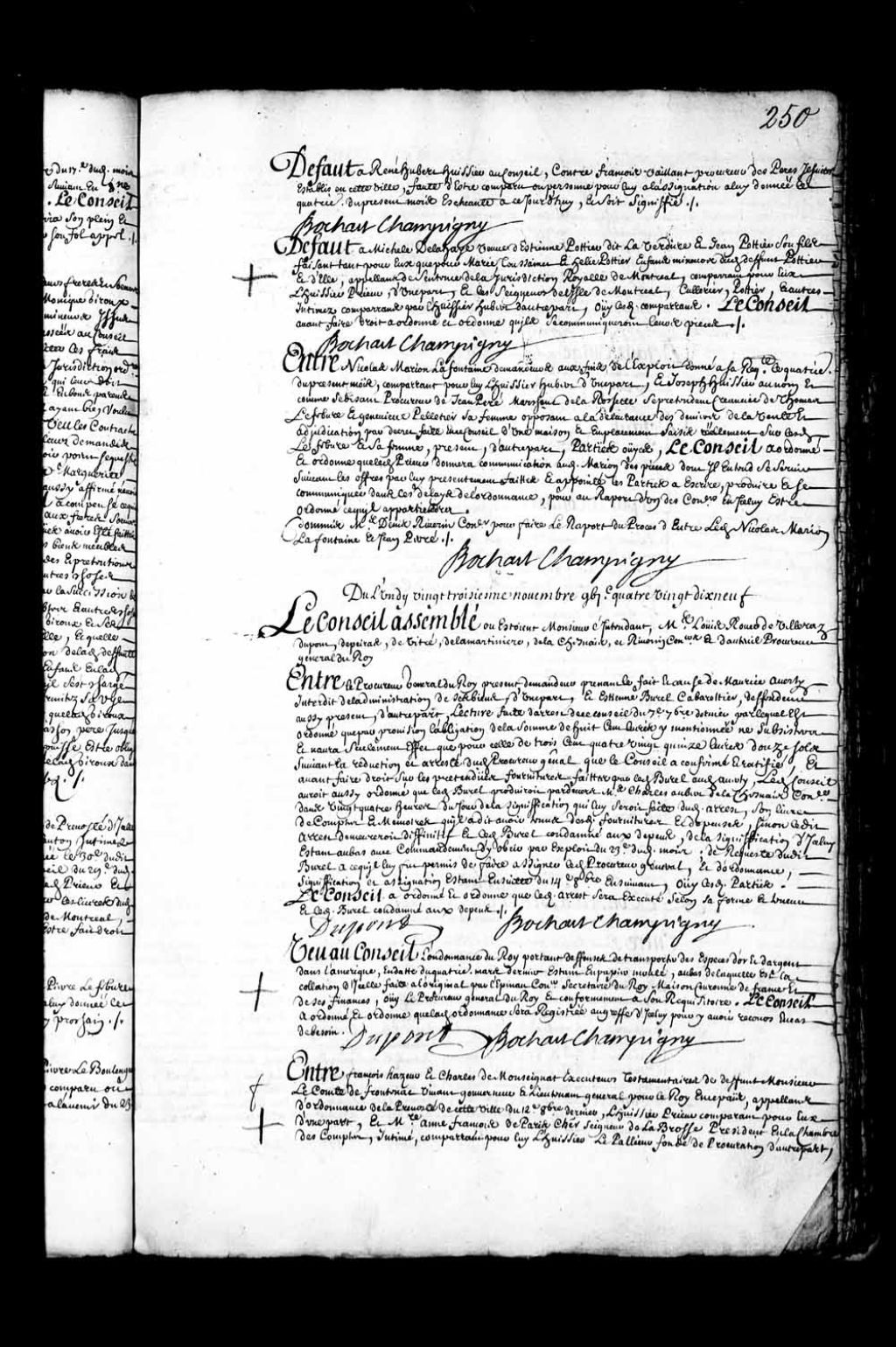 Transcription du texte avec orthographe modernisée : «Défaut à Michelle de Lahaie veuve de Etienne Potier dit LaVerdure et Jean Potier son fils faisant tant pour eux que pour Marie Toussaint et Elie Potier enfants mineurs dudit défunt Potier et d'elle appelant de sentence de la juridiction royale de Montréal, comparant pour eux l'huissier Prieur, d'une part, et les seigneurs de l'île de Montréal, Cullerier, Potier, et autres intimés comparants. par l'huissier Hubert d'autre part, ouï lesdits comparants. Le Conseil avant faire droit a ordonné et ordonne qu'ils se communiqueront leurs pièces. BOCHART CHAMPIGNY.»