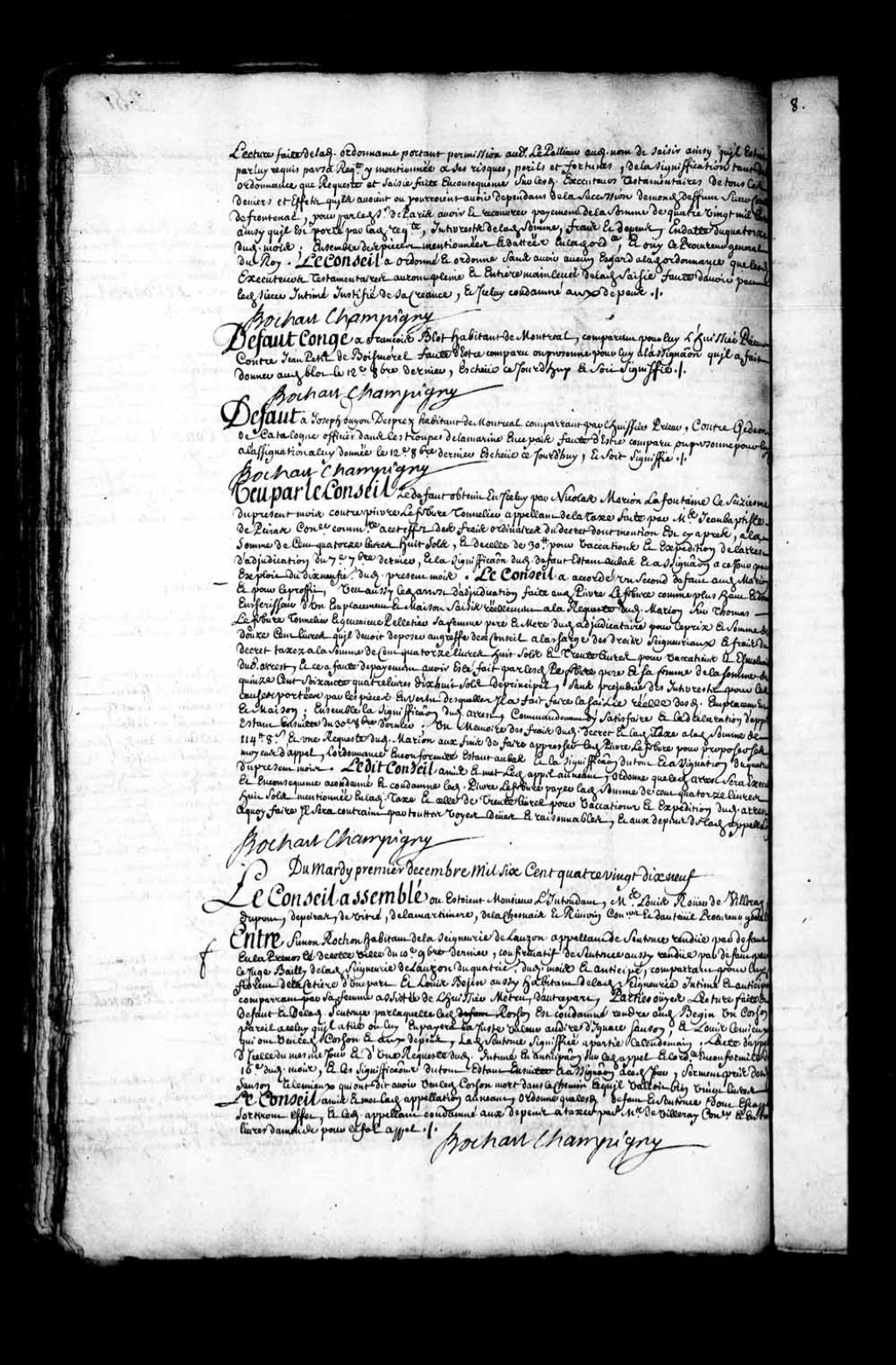 Transcription du texte avec orthographe modernisée : «Défaut congé à François Blot (Bleau) habitant de Montréal, comparant pour lui l'huissier Prieur contre Jean Petit de Boismorel faute d'être comparu ou personne pour lui à l'assignation qu'il a fait donner audit blot le 12e octobre dernier, échue ce jourd'hui, et soit signifié. BOCHART CHAMPIGNY.»