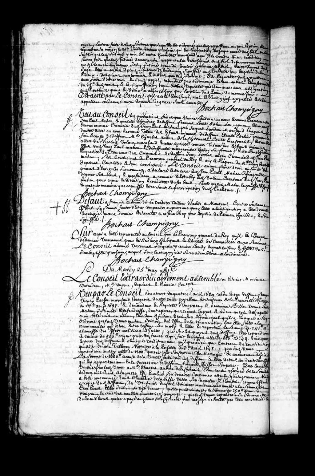 Transcription du texte avec orthographe modernisée : «Vu au Conseil les productions faites par Etienne Landron au nom et comme procureur de Jean-Paul Maheu en qualité d'héritier de défunt François Louis Maheu son neveu, et demandeur encore comme créancier dudit Jean-Paul Maheu par Jacques Gourdeau marchand bourgeois de cette ville au nom et comme tuteur des enfants mineurs de défunt Claude Porlier prenant le fait et cause de défunt maître Charles Aubert de Lachesnais conseiller en ce Conseil, ensemble celles de Nicolas Volant marchand en cette dite ville comme tuteur des enfants mineurs issus dudit Jean-Paul Maheu et de défunte Marguerite Tesson sa femme, et de René Hubert en qualité de procureur des créanciers de défunt Jean Garros aussi créancier dudit Jean-Paul Maheu; les conclusions du procureur général du Roi et ouï le rapport de maître Jean-Baptiste Depeiras conseiller et tout considéré. Le Conseil avant faire droit au fonds du procès d'entre les sus-nommés, a déclaré et déclare ledit Jean-Paul Maheu incapable de gérer ses biens, et en ce faisant a nommé et établi ledit Volant curateur dudit Jean-Paul Maheu pour avoir la direction et conduite de ses biens, sans que ledit Maheu en puisse disposer de quelque manière que ce puisse être sans la participation dudit curateur. BOCHART CHAMPIGNY.»