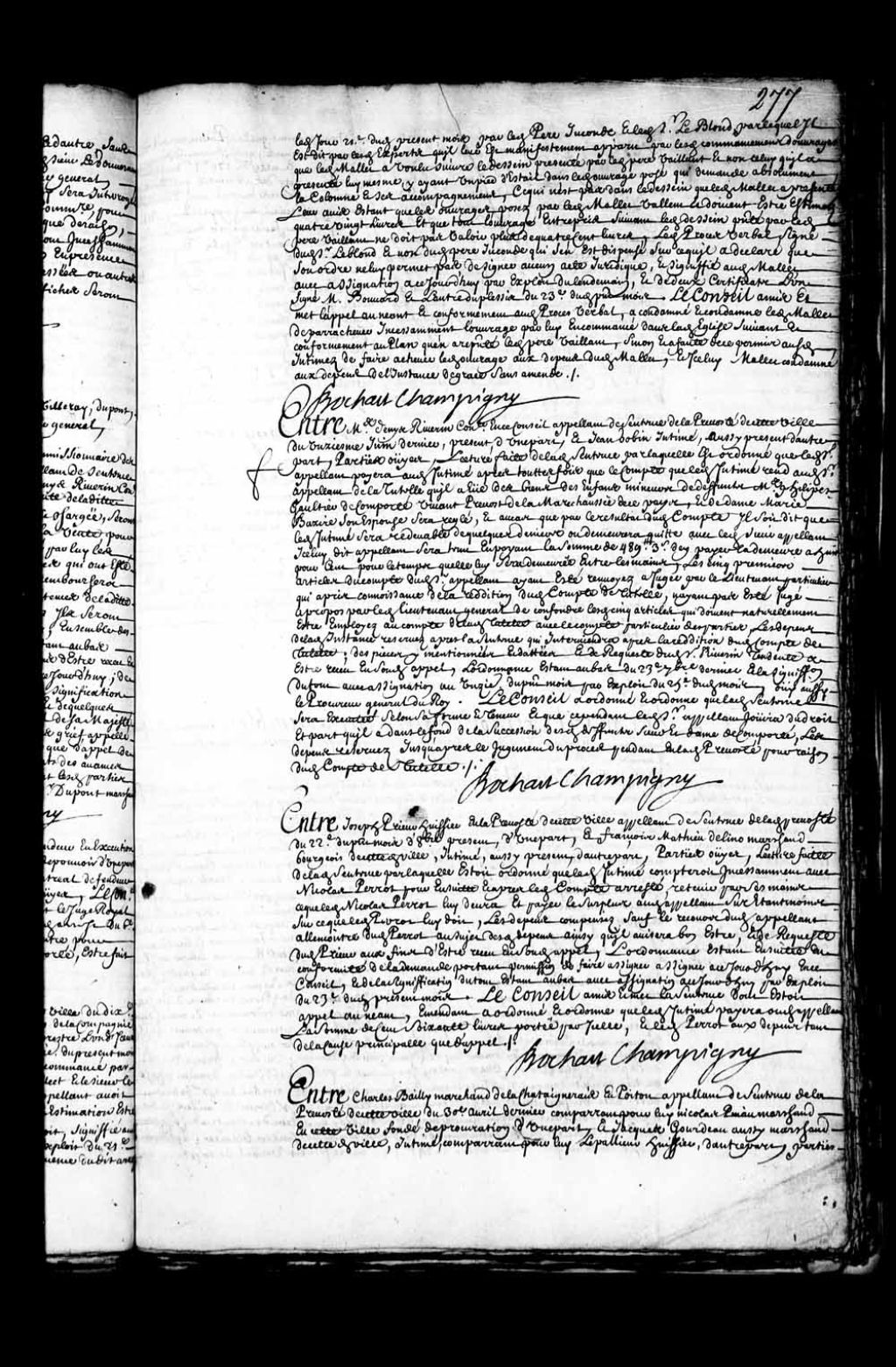 - Transcription du texte avec orthographe modernisée : «Entre Joseph PRIEUR huissier en la prévôté de cette ville appelant de sentence de ladite prévôté du 22e du présent mois d'octobre présent, d'une part, et François Mathieu DELINO (De Lino) marchand bourgeois de cette dite ville, intimé, aussi présent, d'autre part. Parties ouïes, lecture faite de ladite sentence par laquelle était ordonné que ledit intimé compterait incessamment avec Nicolas Perrot pour ensuite et après ledit compte arrêté, retenir pas ses mains ce que ledit Nicolas Perrot lui devra et payer le surplus audit appelant sur étant moins sur ce que ledit Perrot lui doit, les dépens compensés sauf le recours dudit appelant à l'encontre dudit Perrot au sujet desdits dépens ainsi qu'il avisera bon être, et de requête dudit Prieur aux fins d'être reçu en sondit appel. L'ordonnance étant ensuite en conformité de la demande portant permission de faire assigner à ce jourd'hui en ce Conseil, et de la signification du tout étant au bas avec assignation à ce jourd'hui par exploit du 23e dudit présent mois. Le Conseil a mis et met la sentence dont était appel au néant, émendant, a ordonné et ordonne que ledit intimé payera audit appelant la somme de cent soixante livres portée par icelle, et ledit Perrot aux dépens tant de la cause principale que d'appel. BOCHART CHAMPIGNY.»