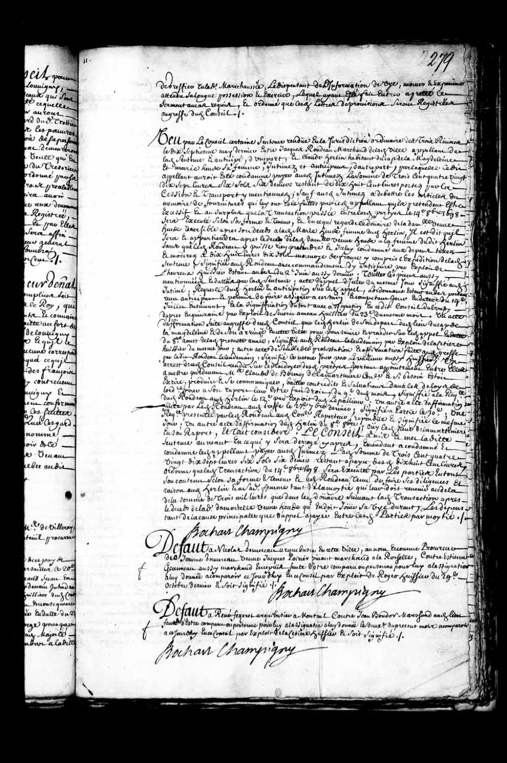 Transcription du texte avec orthographe modernisée : «Défaut à Nicolas Gouvereau arquebusier en cette ville, au nom et comme procureur de Jeanne Gouvereau (Gauvereau, Gauvreau) veuve Jacques Poirier vivant marchand à La Rochelle, contre Etienne Geanneau (Janneau, Janot) aussi marchand en ce pays faute d'être comparu ou personne pour lui à l'assignation à lui donnée à comparaître ce jourd'hui en ce Conseil par exploit de Roger huissier du 29e octobre dernier et soit signifié. BOCHART CHAMPIGNY.»
